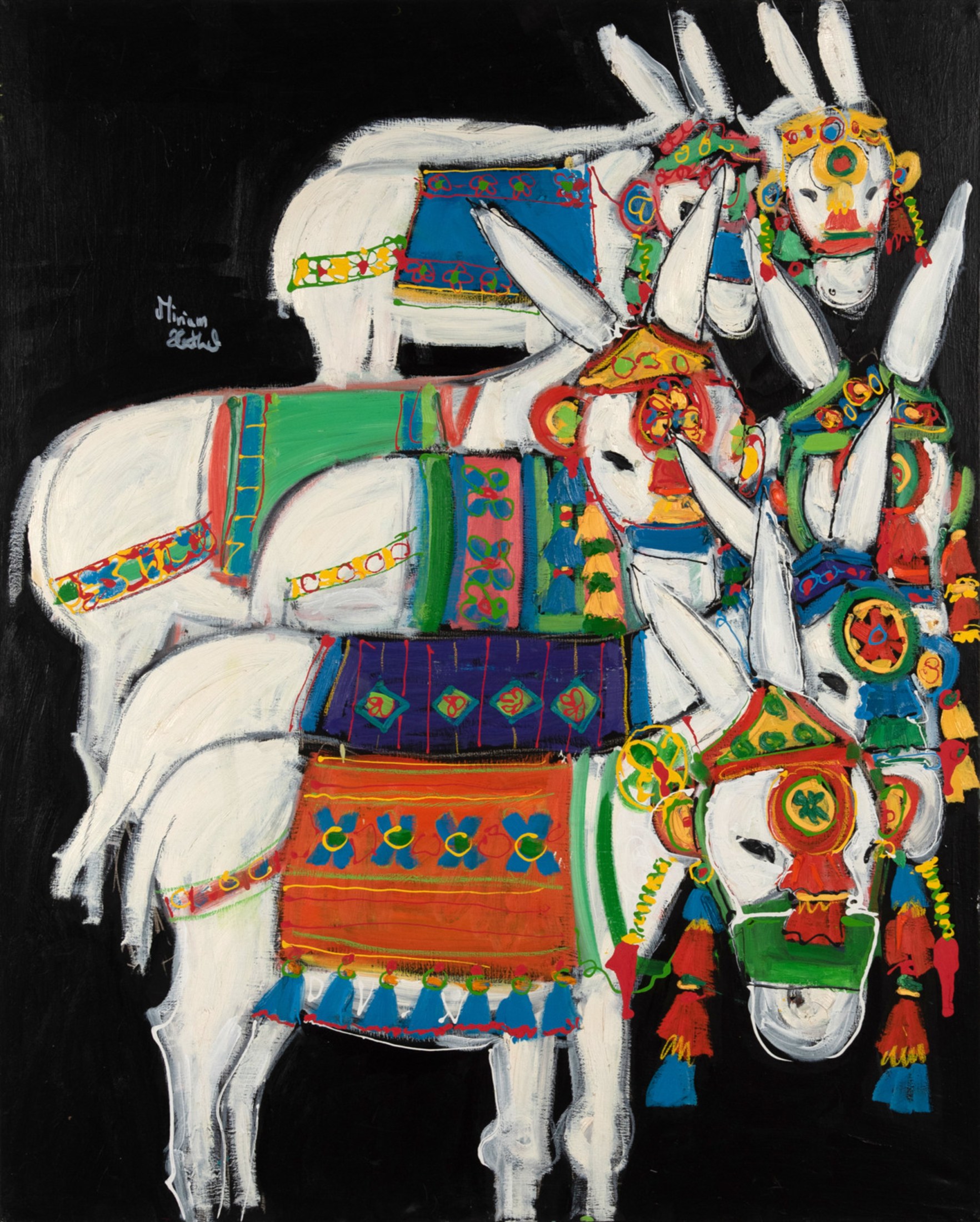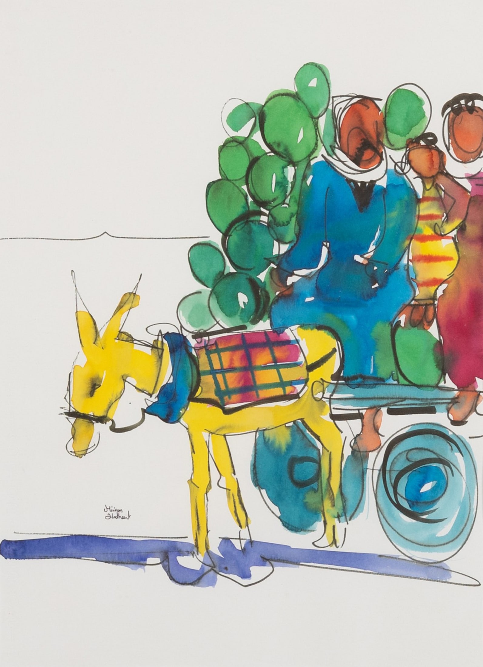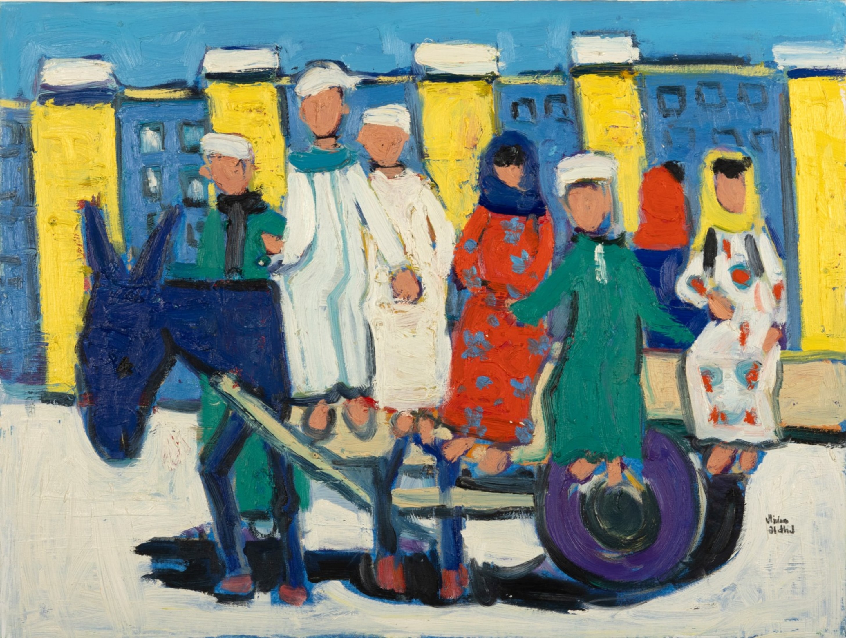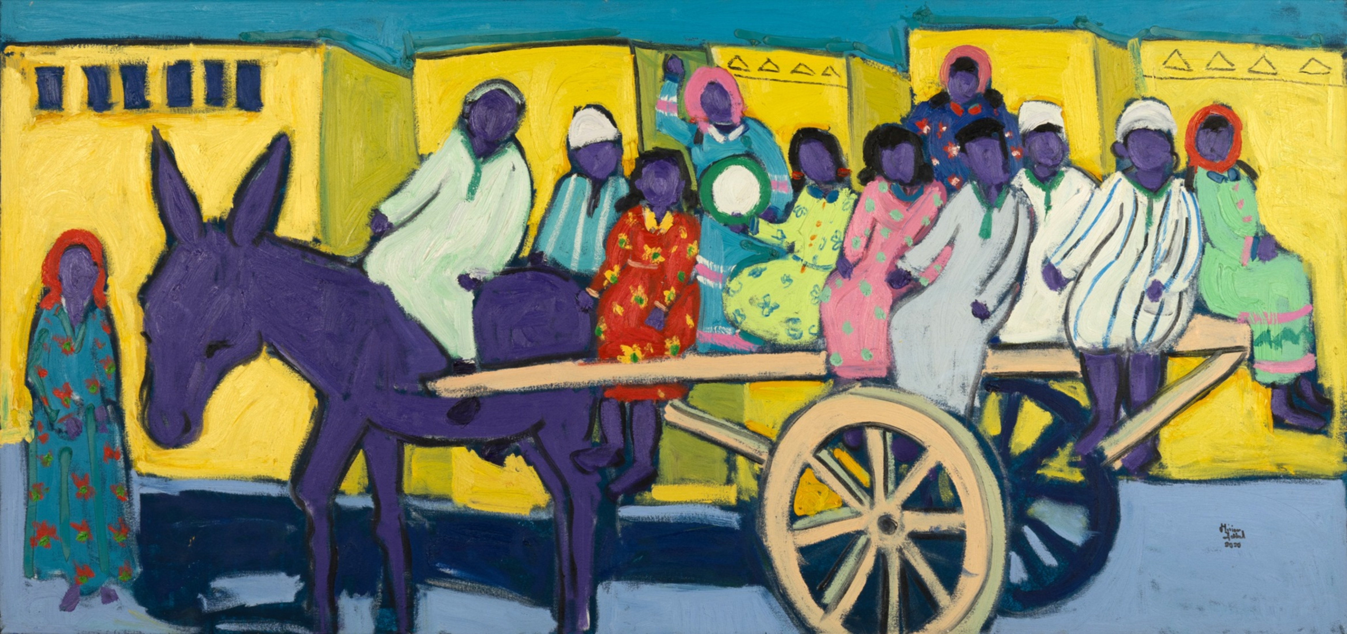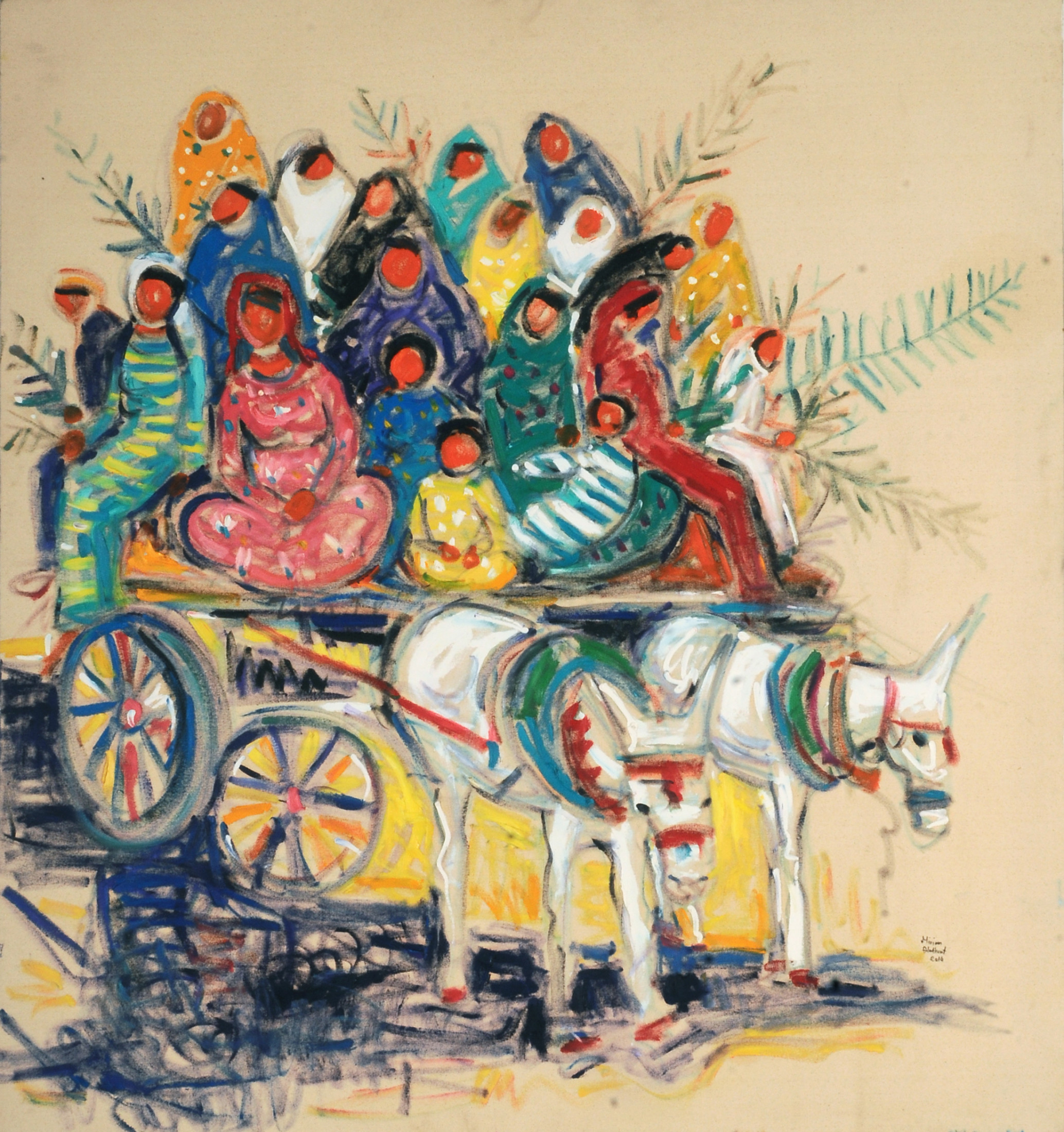 Miriam Hathout is a passionate painter who uses vibrant colors to portray scenes from the Egyptian countryside. Donkeys, dancers, and women harvesting in the fields are common themes in her work.
