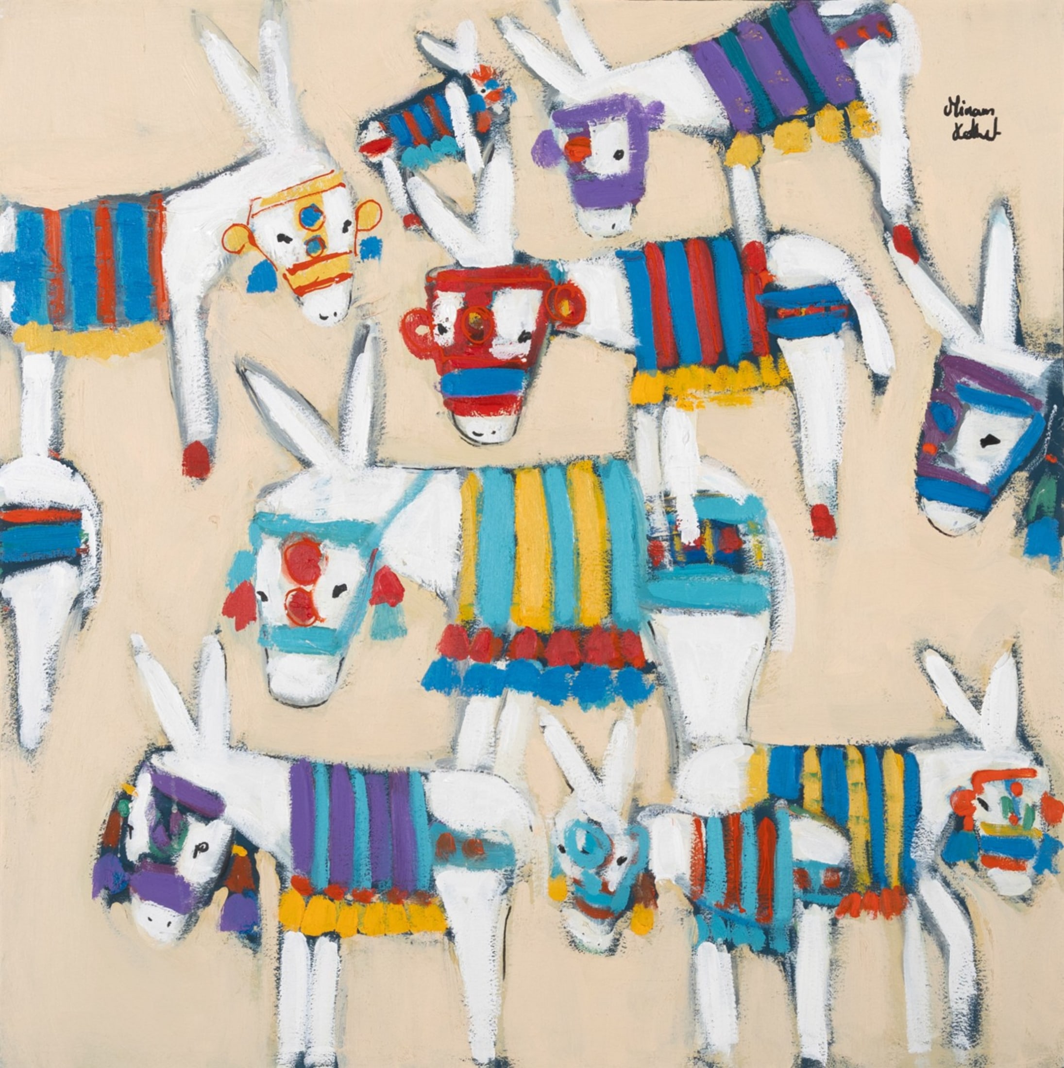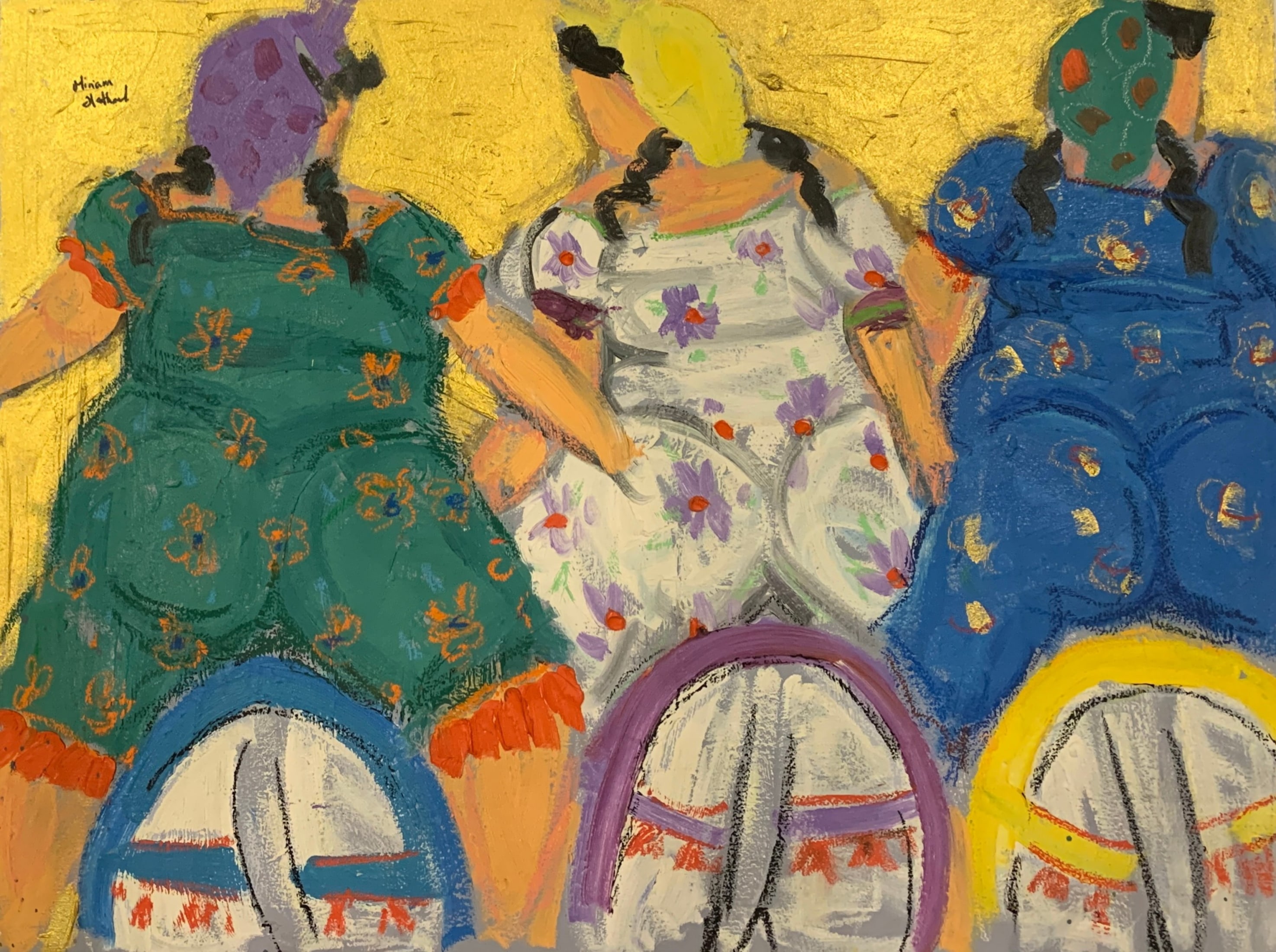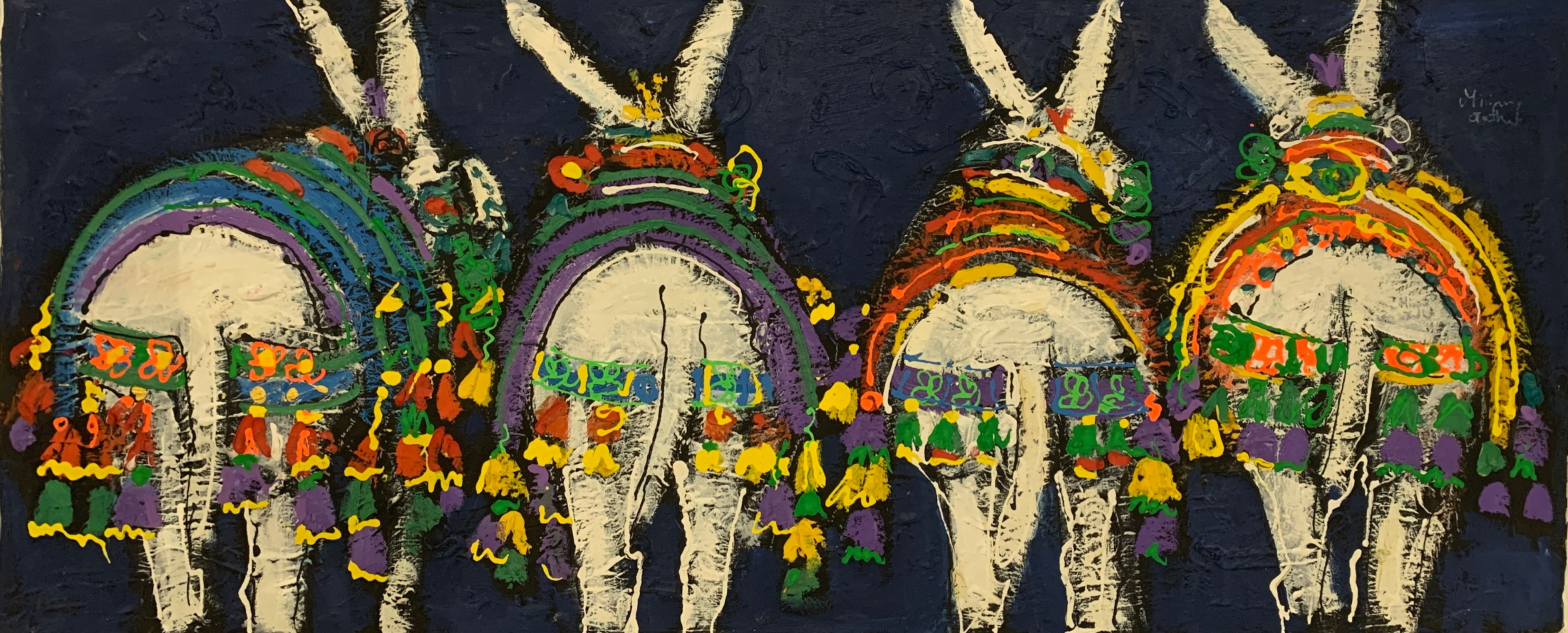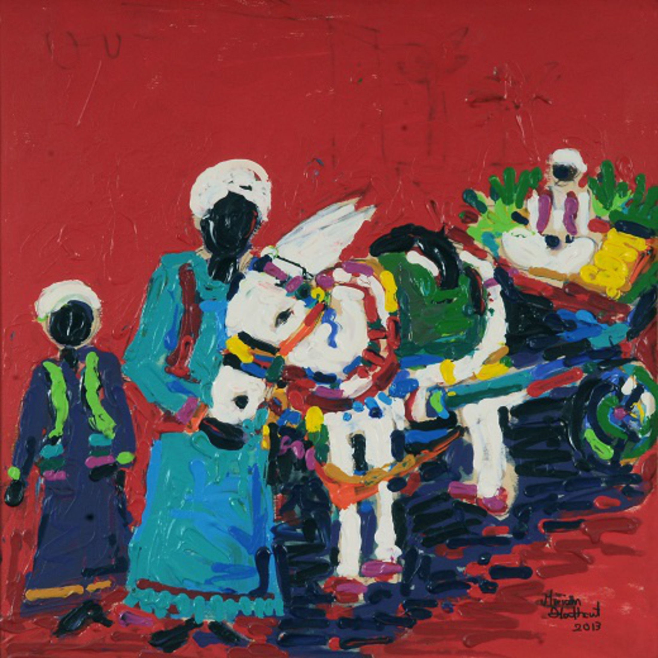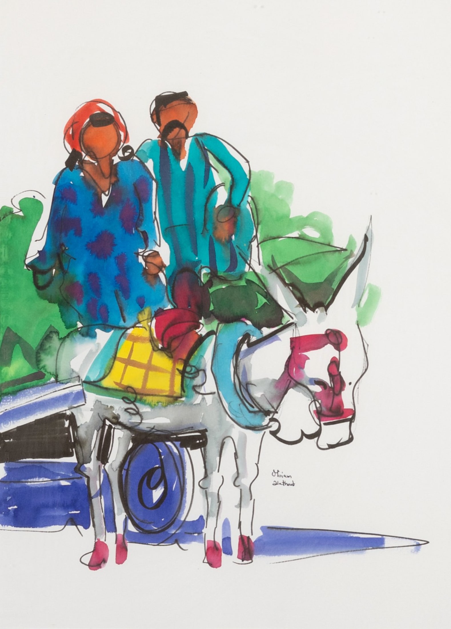Miriam Hathout is a passionate painter who uses vibrant colors to portray scenes from the Egyptian countryside. Donkeys, dancers, and women harvesting in the fields are common themes in her work.