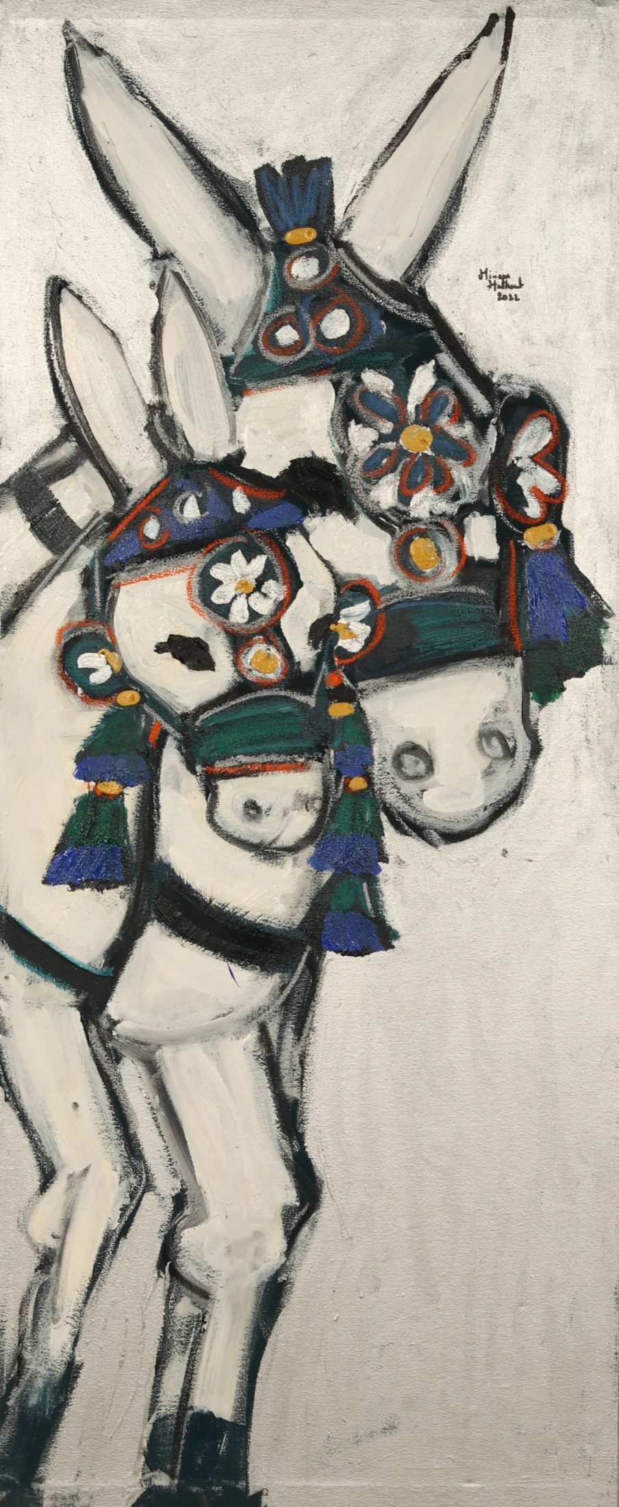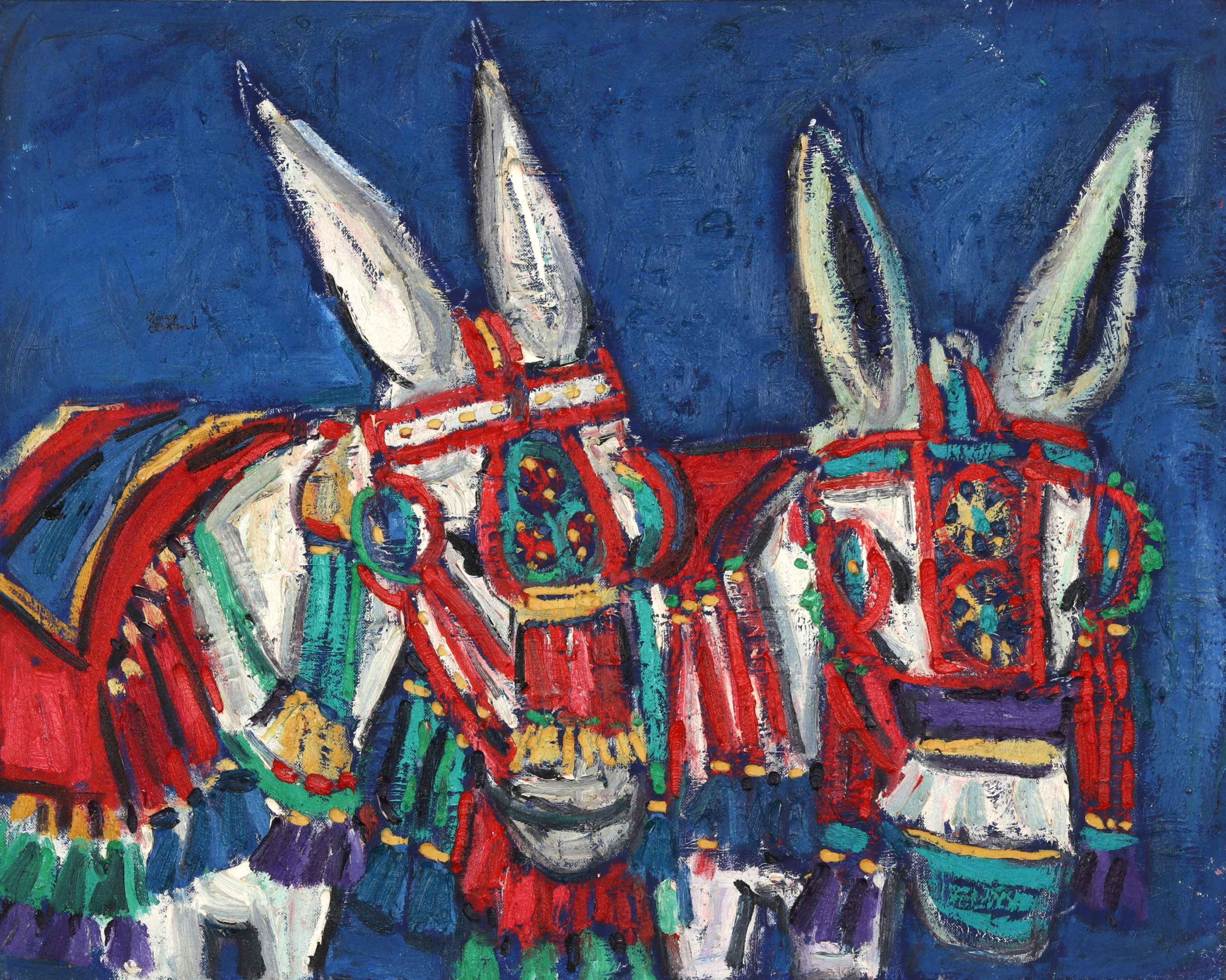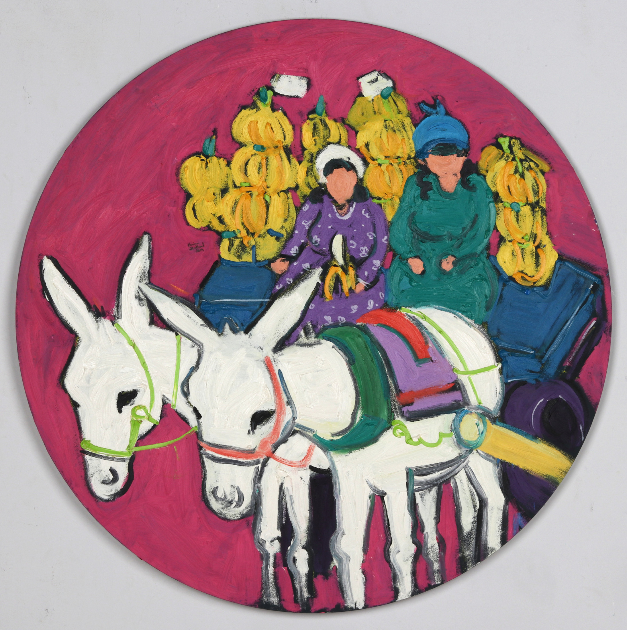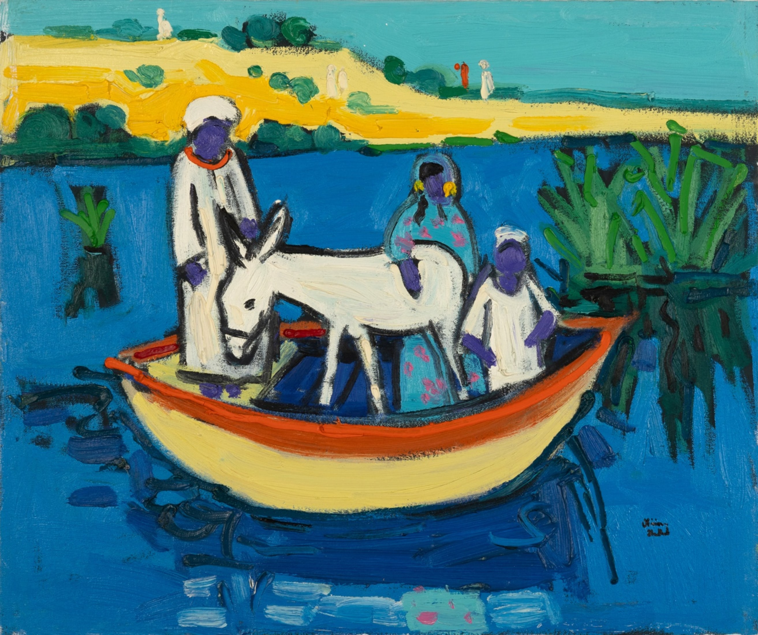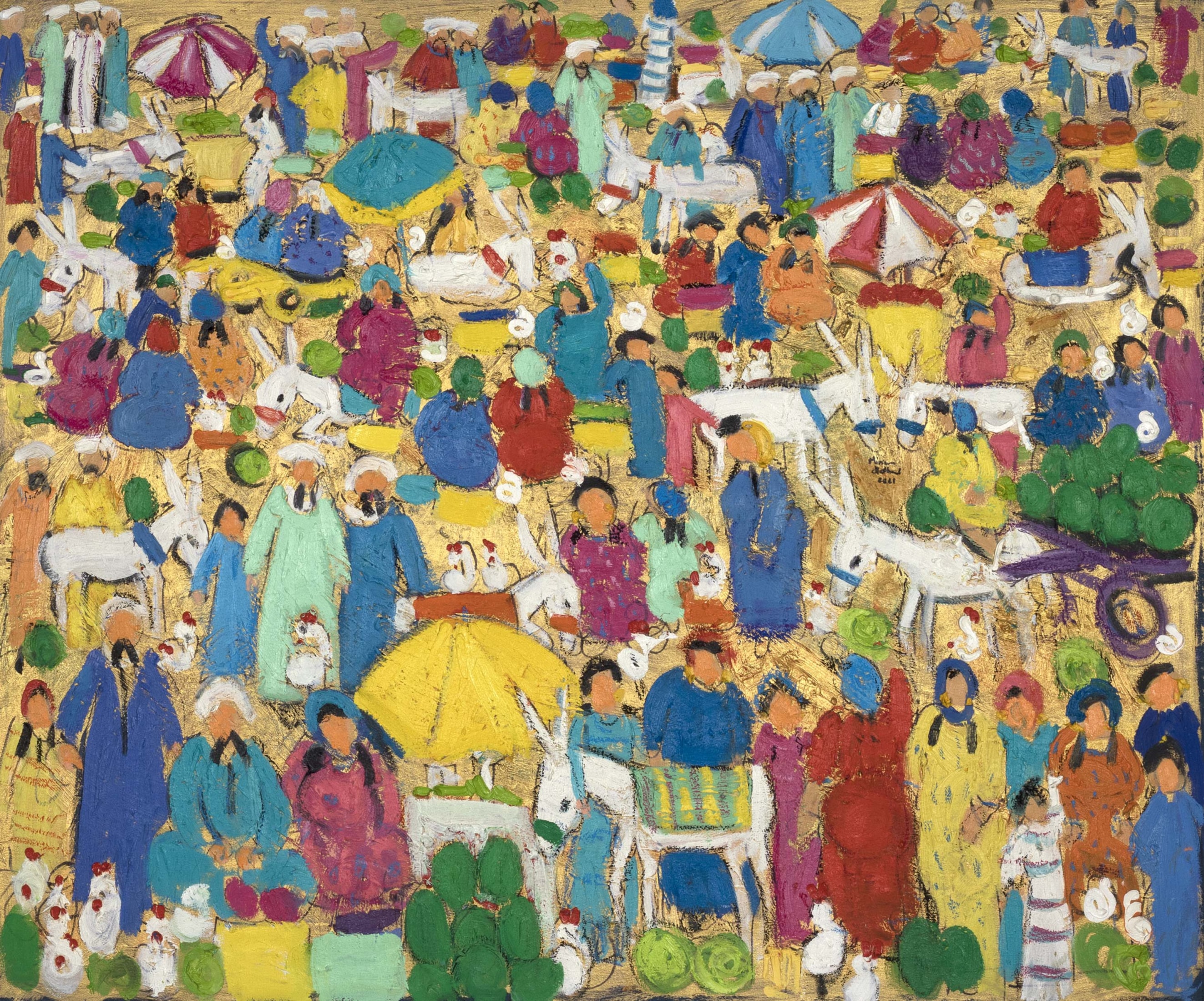 Miriam Hathout is a passionate painter who uses vibrant colors to portray scenes from the Egyptian countryside. Donkeys, dancers, and women harvesting in the fields are common themes in her work.