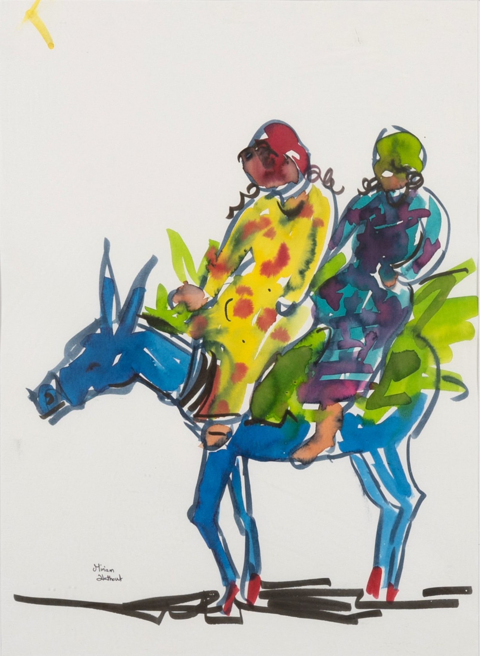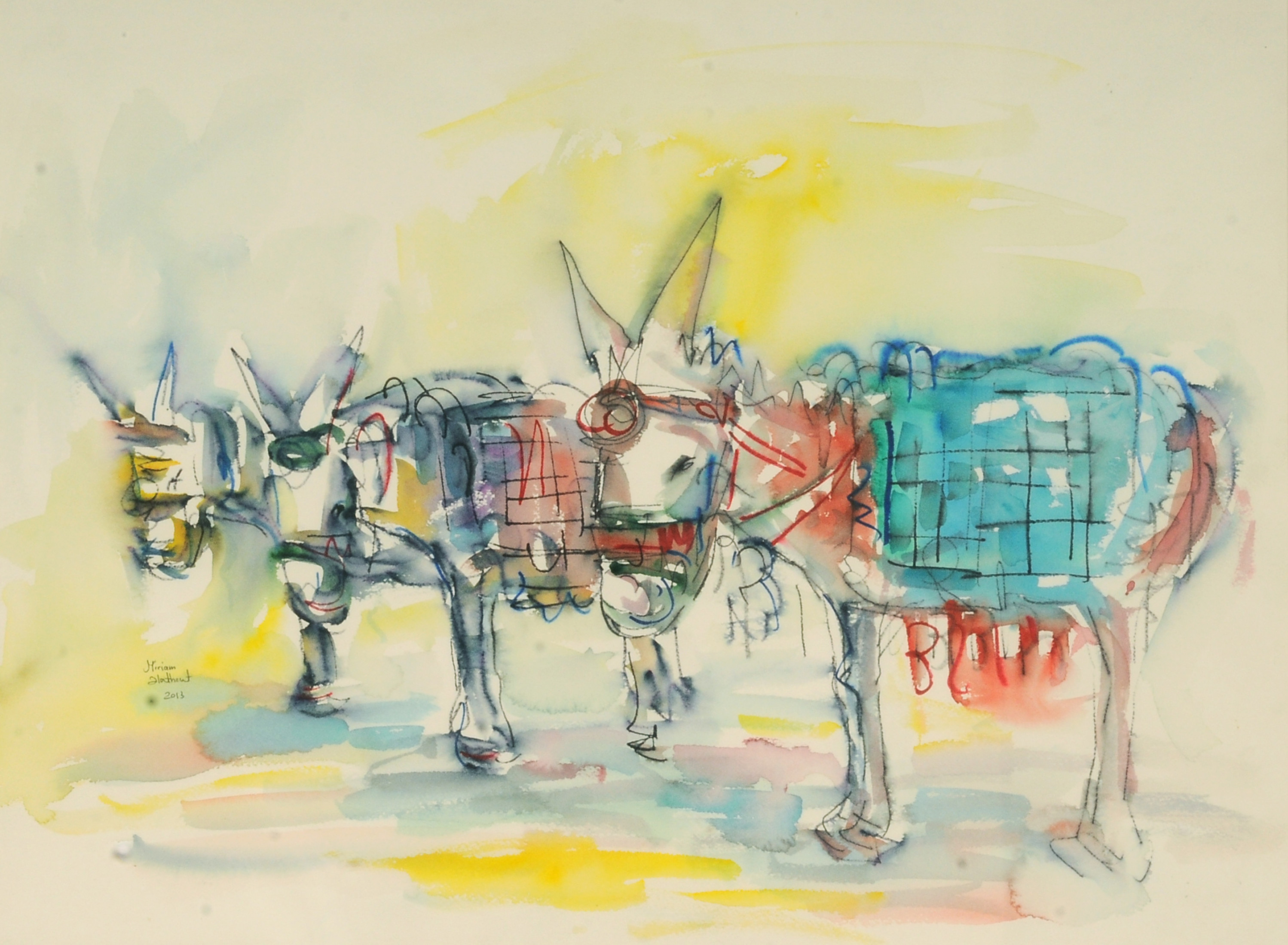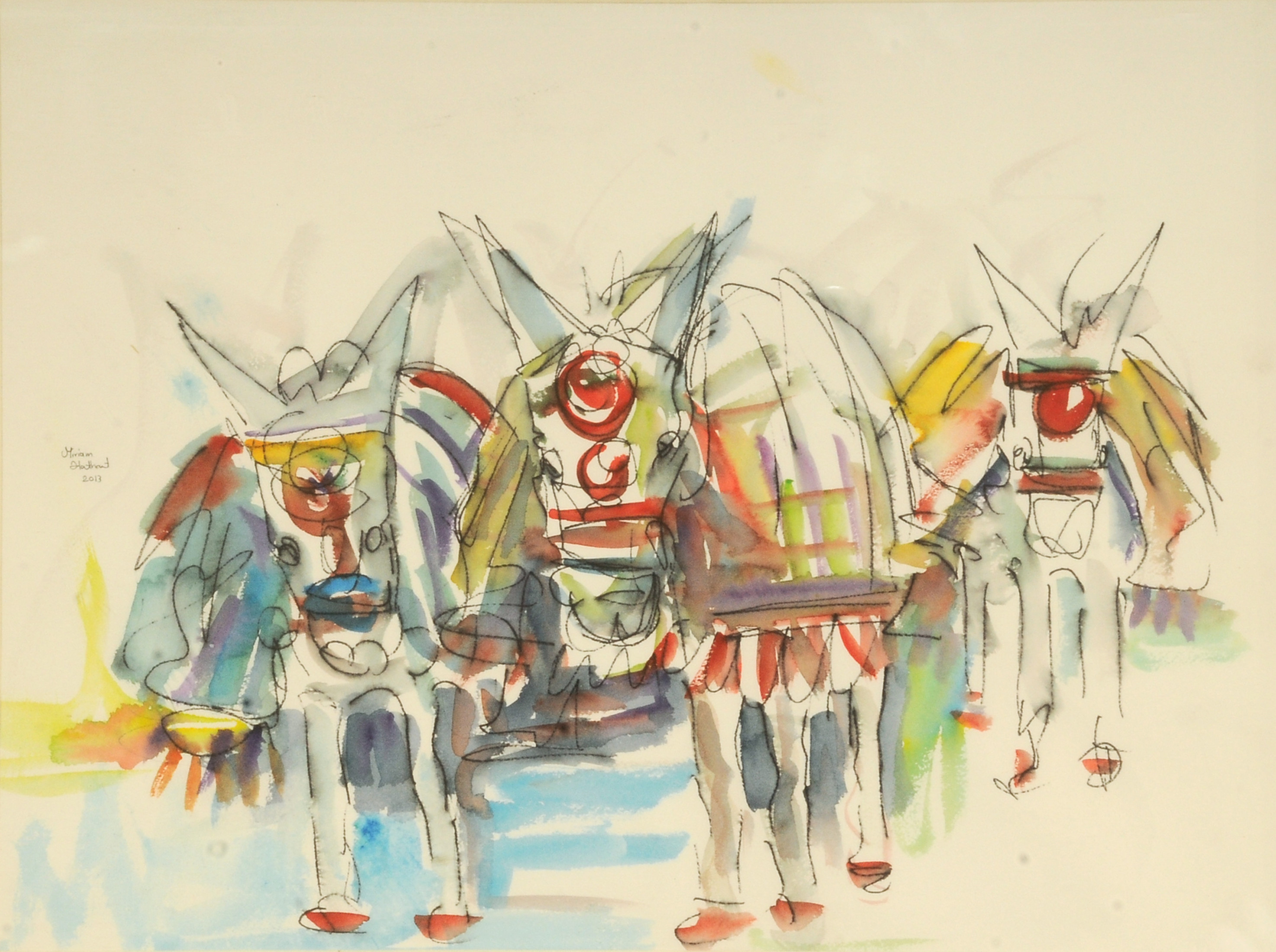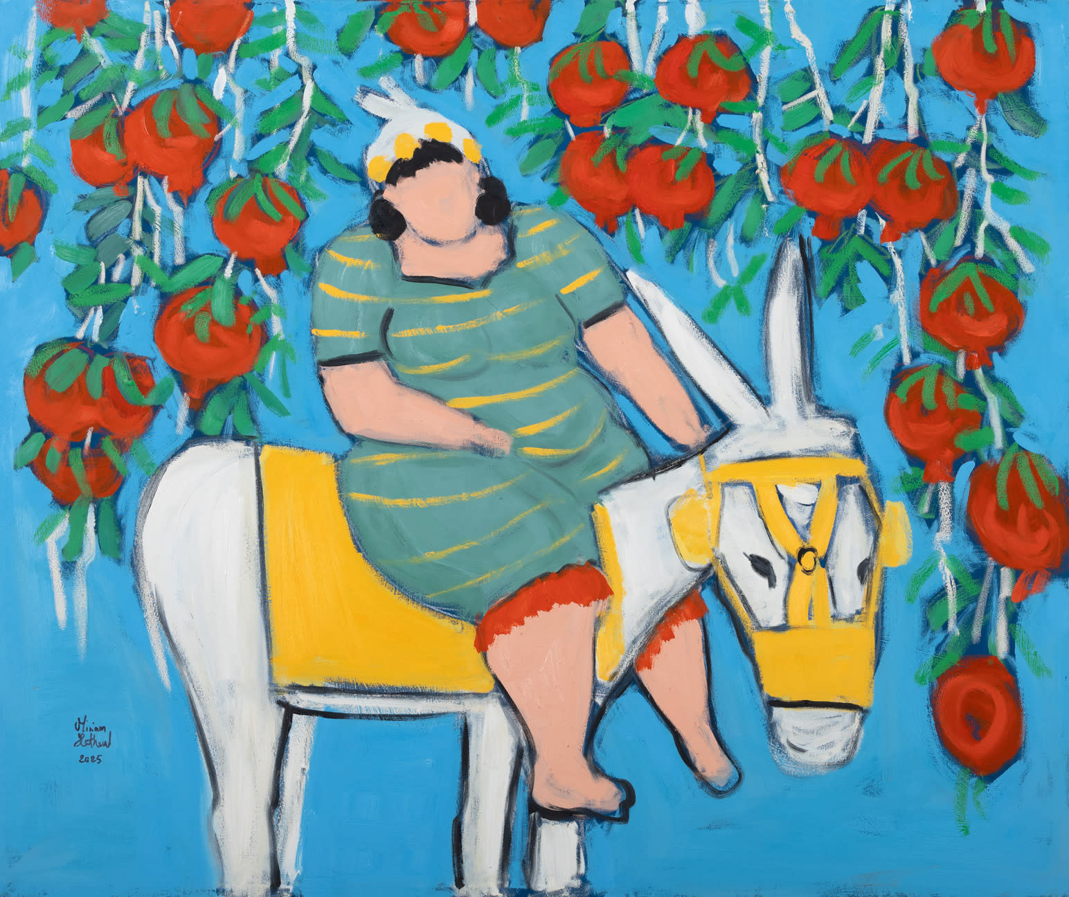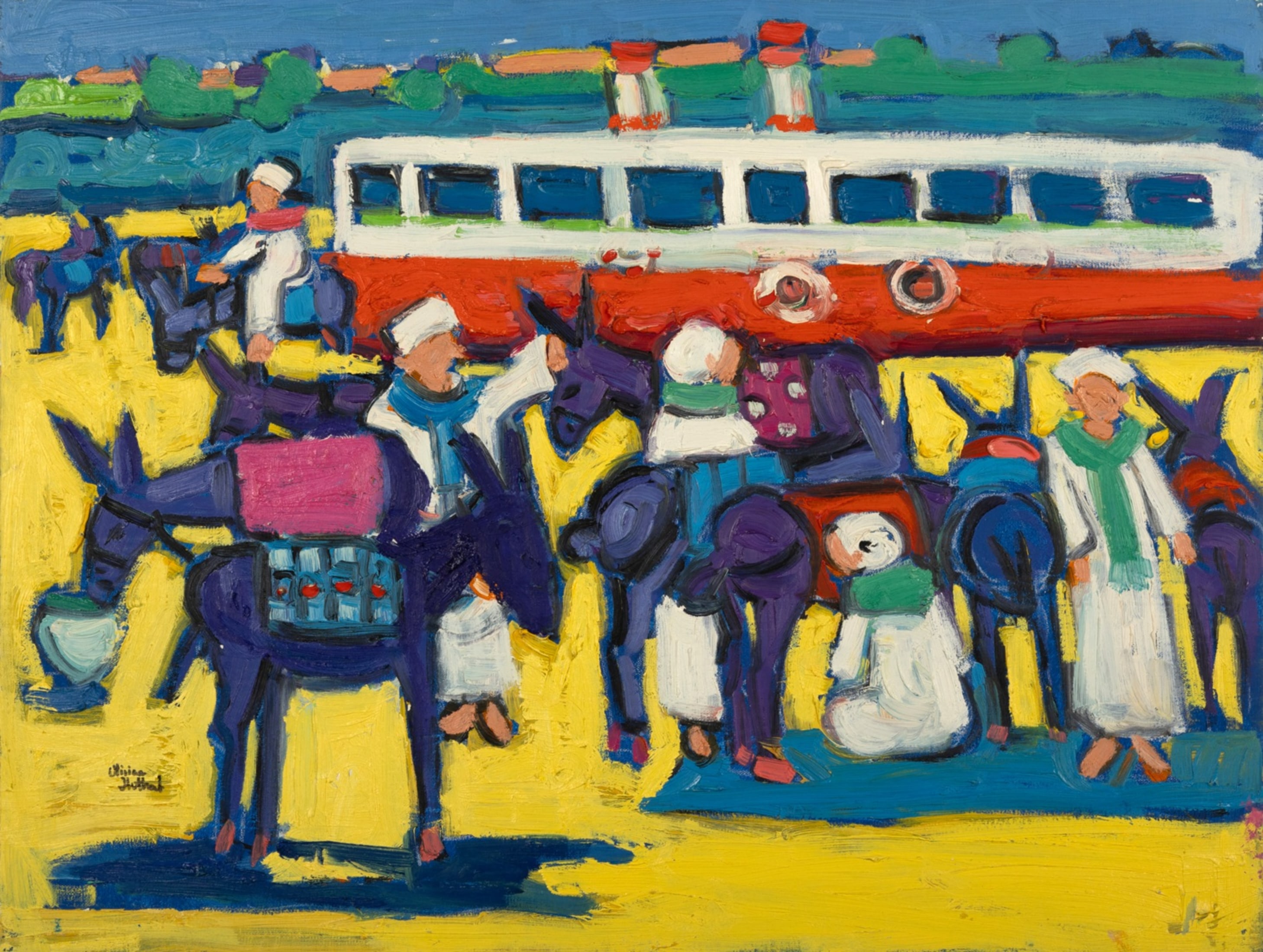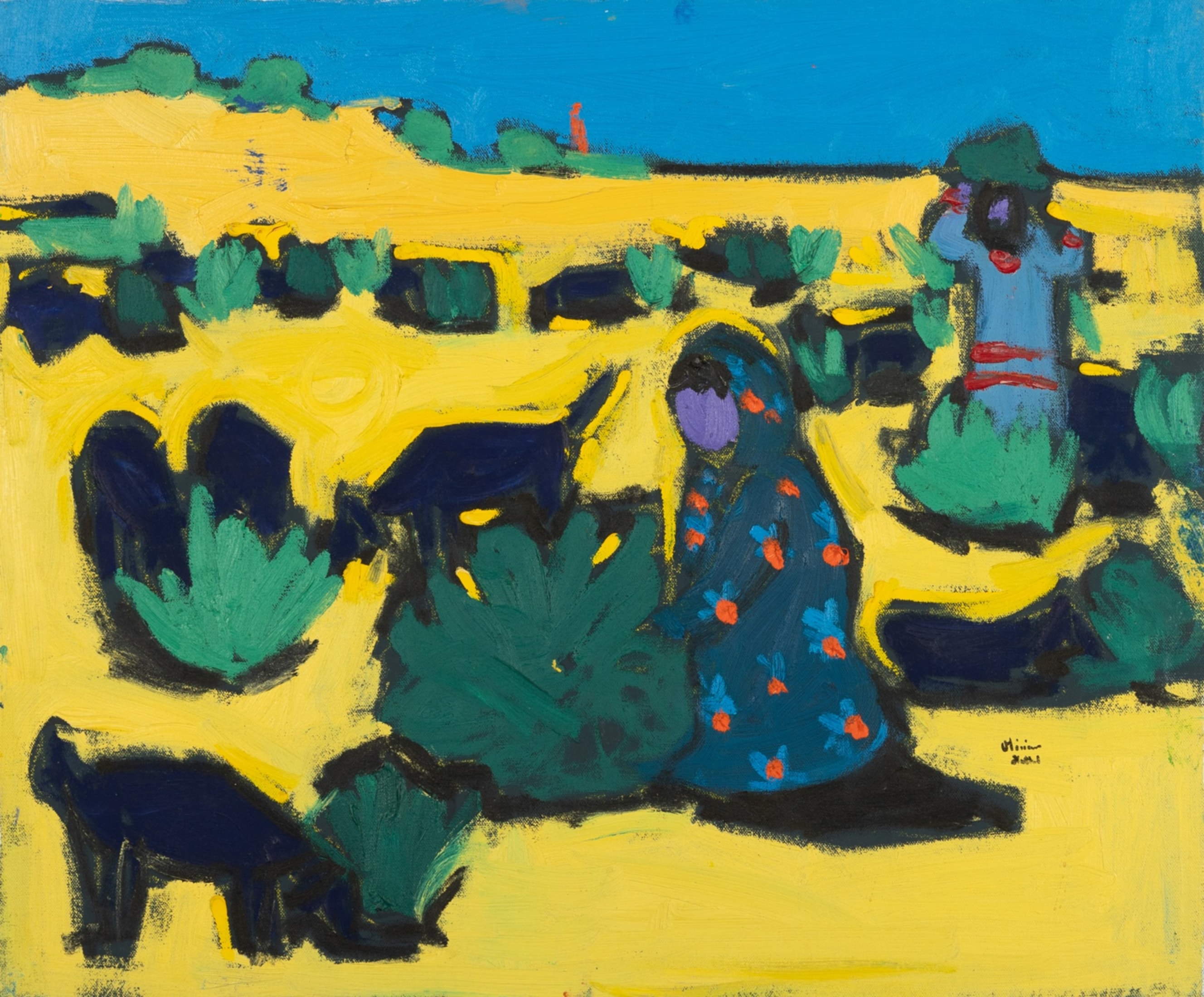 Miriam Hathout is a passionate painter who uses vibrant colors to portray scenes from the Egyptian countryside. Donkeys, dancers, and women harvesting in the fields are common themes in her work.