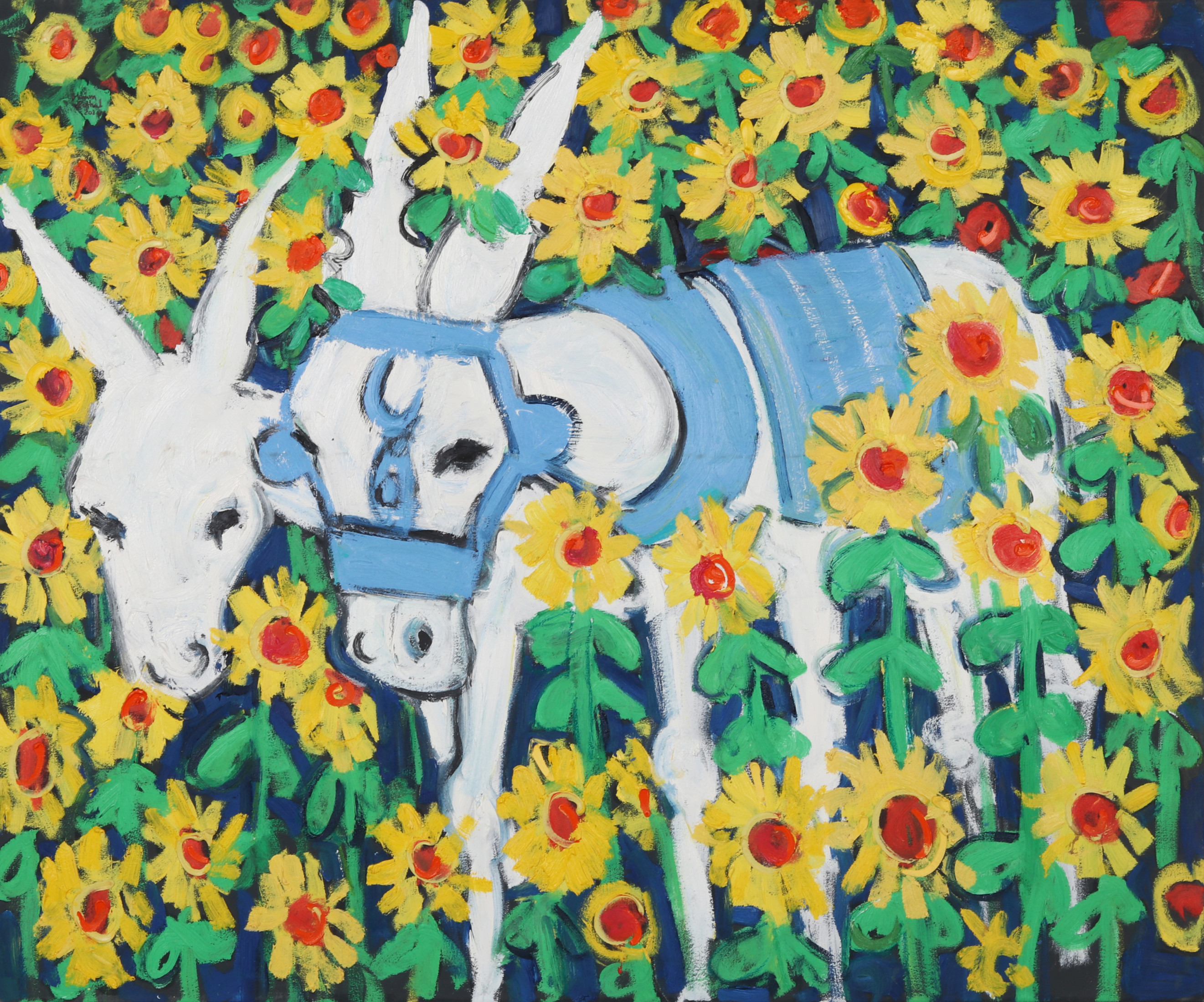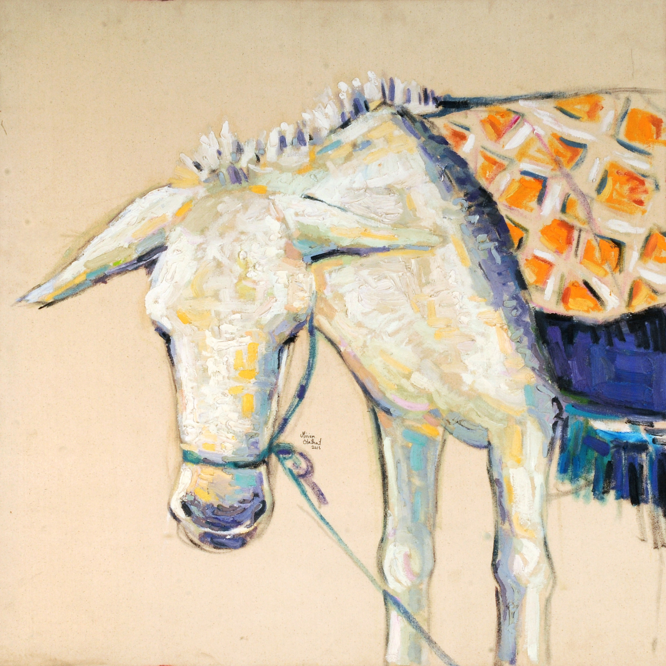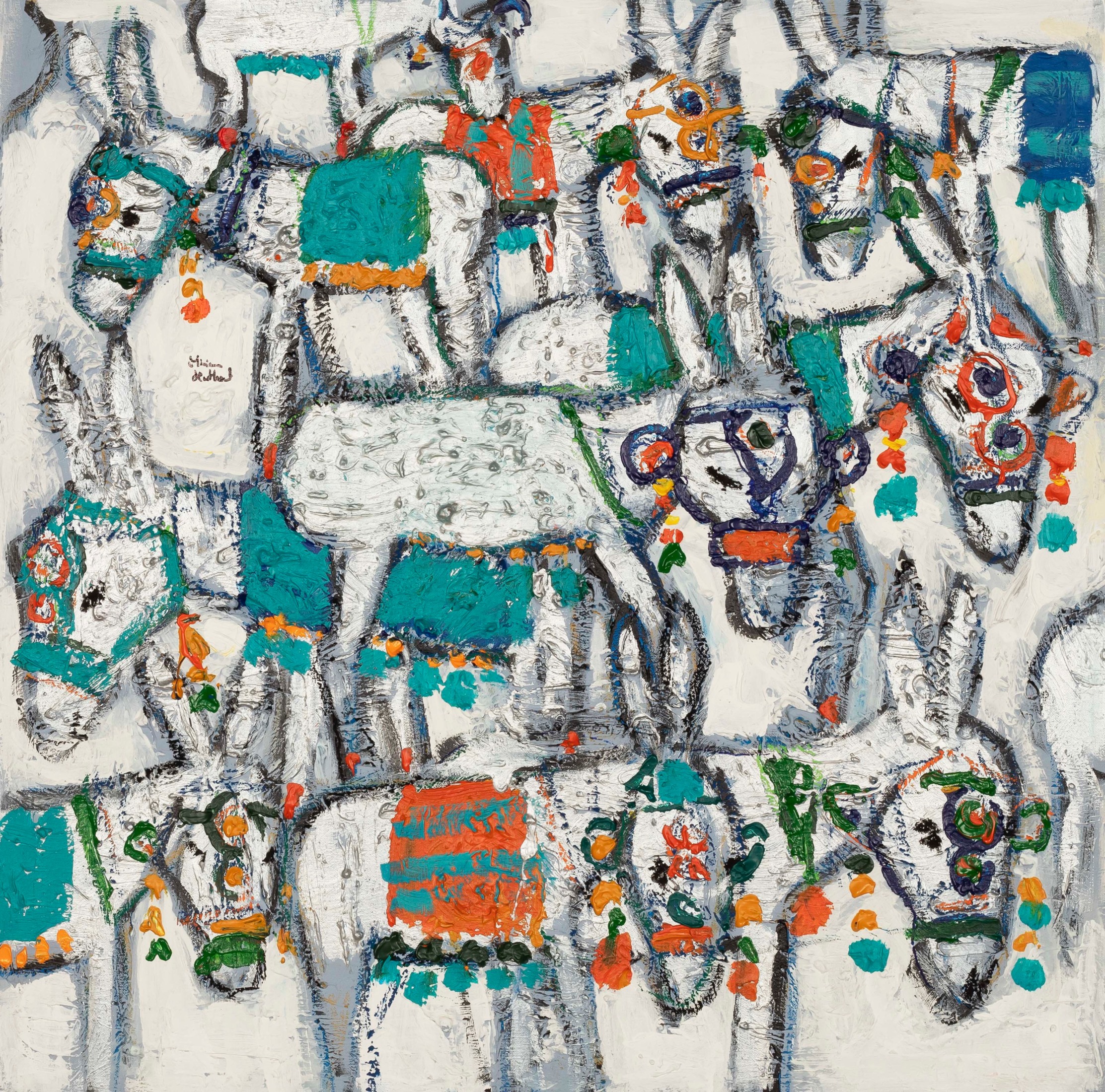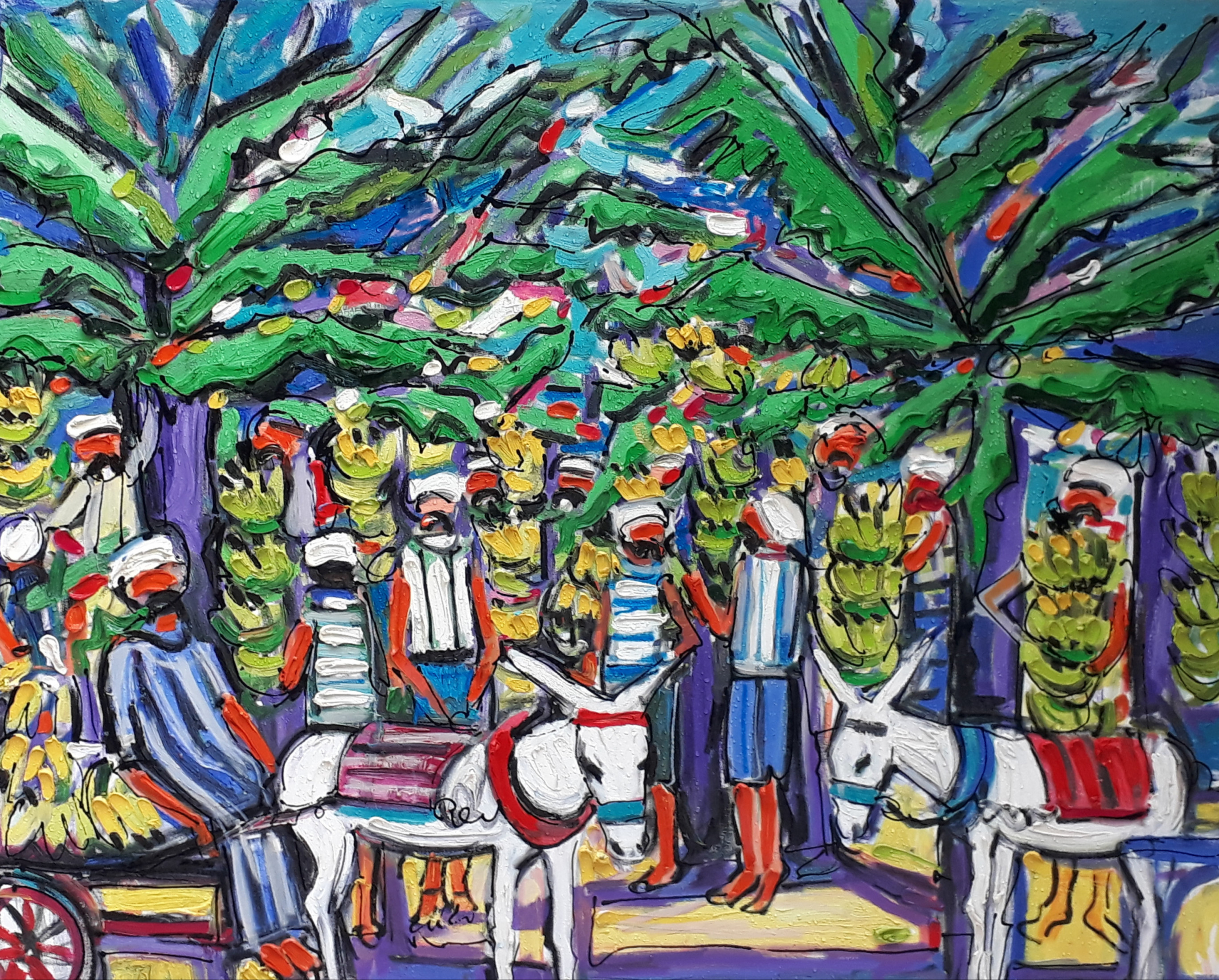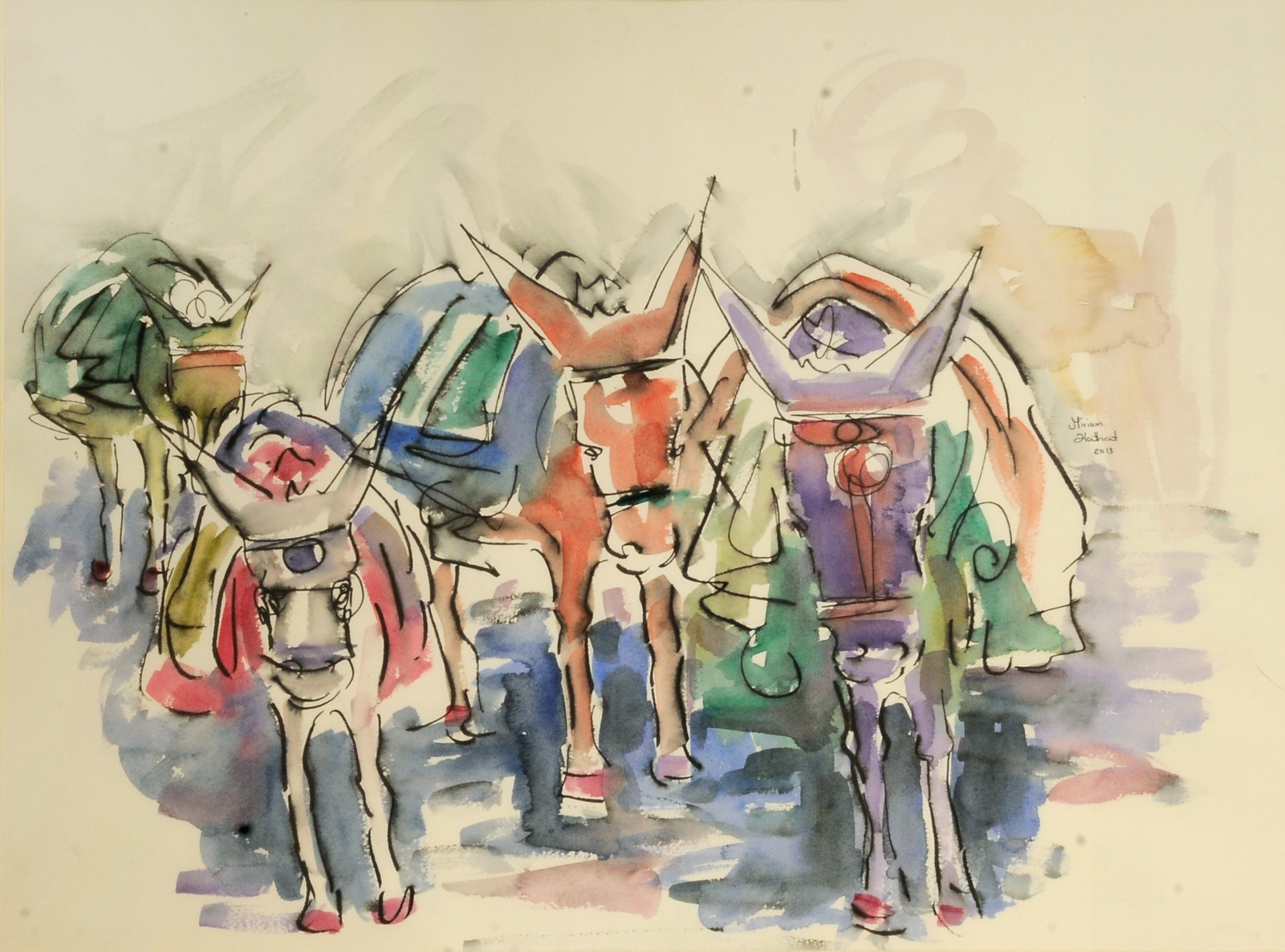 Miriam Hathout is a passionate painter who uses vibrant colors to portray scenes from the Egyptian countryside. Donkeys, dancers, and women harvesting in the fields are common themes in her work.