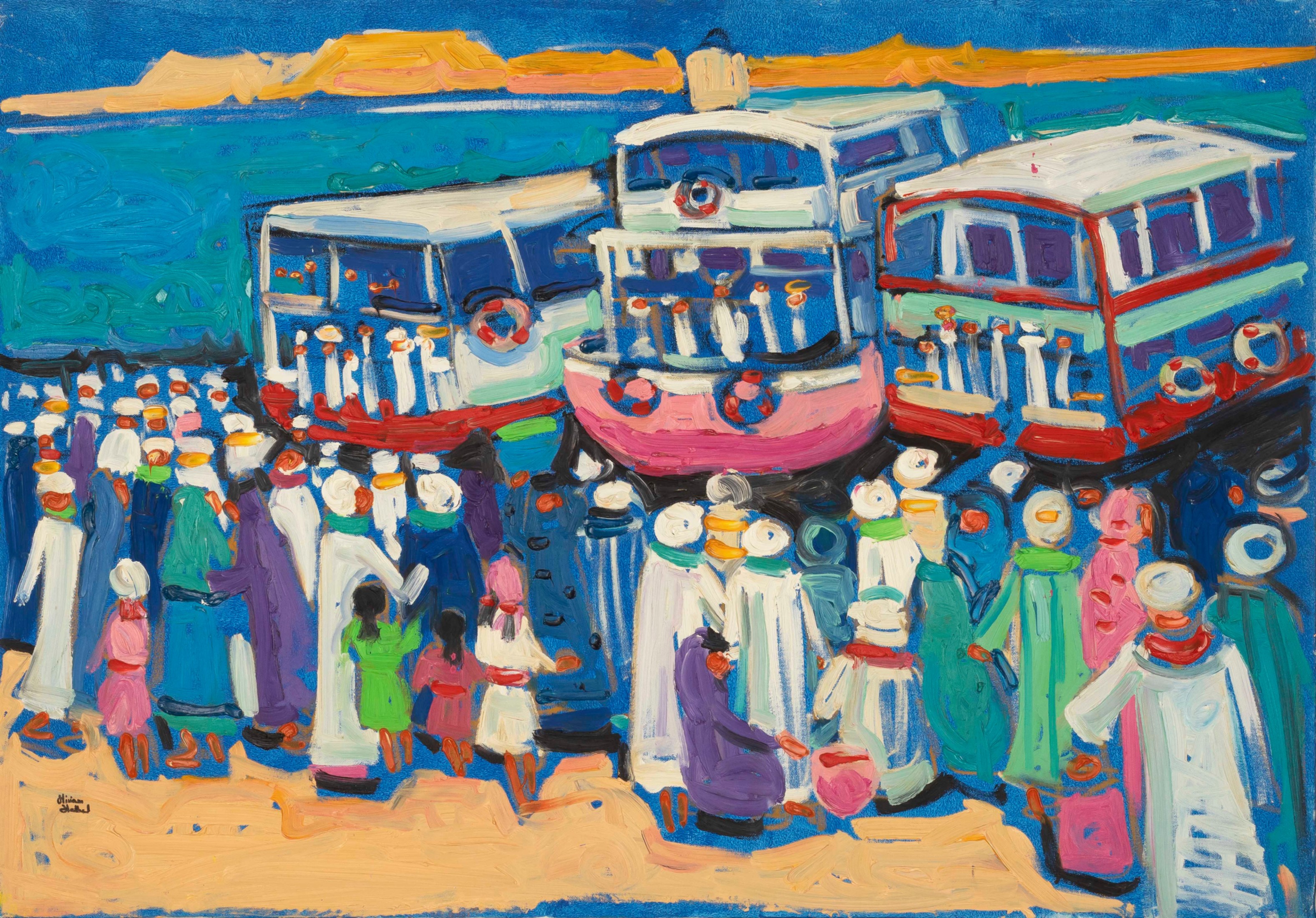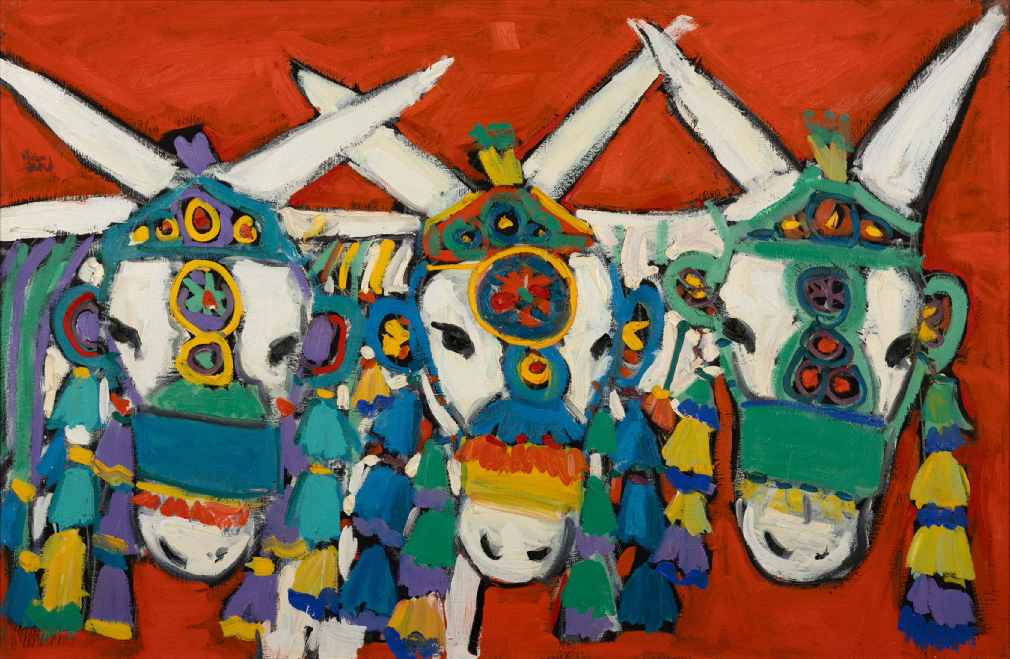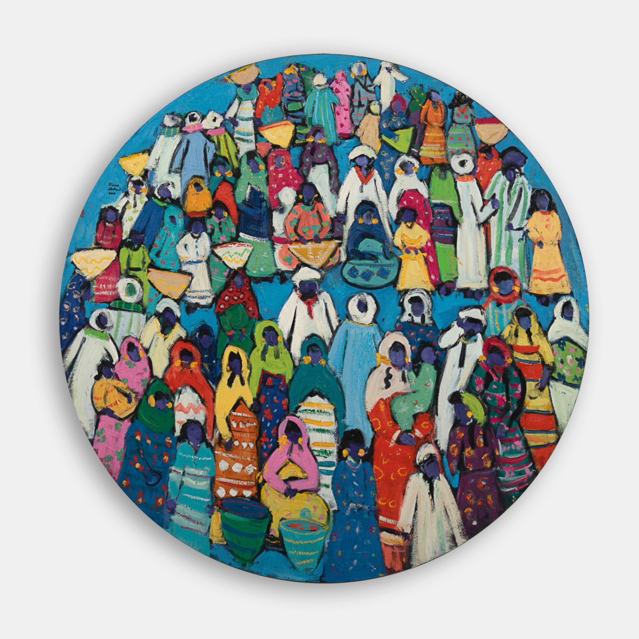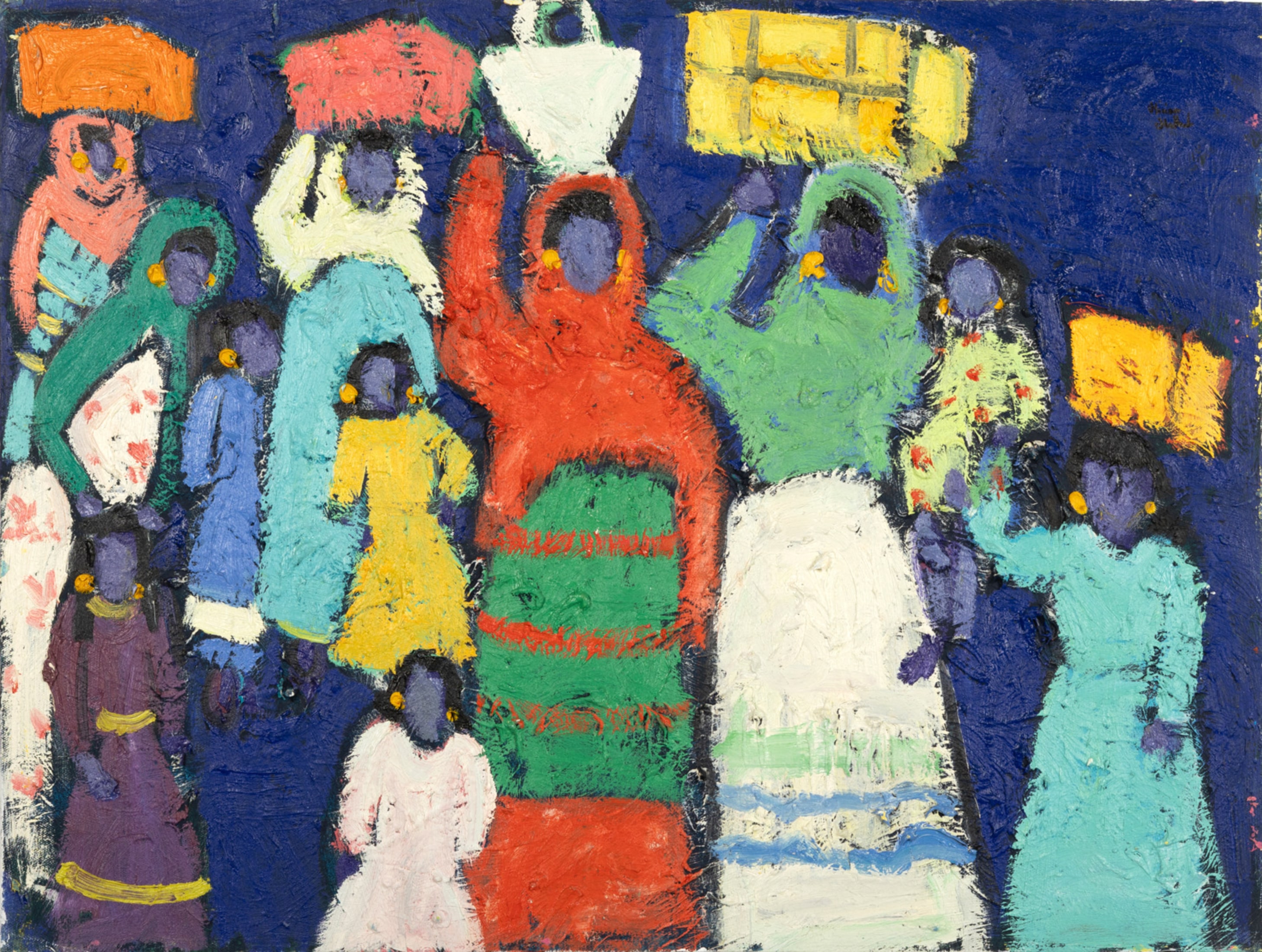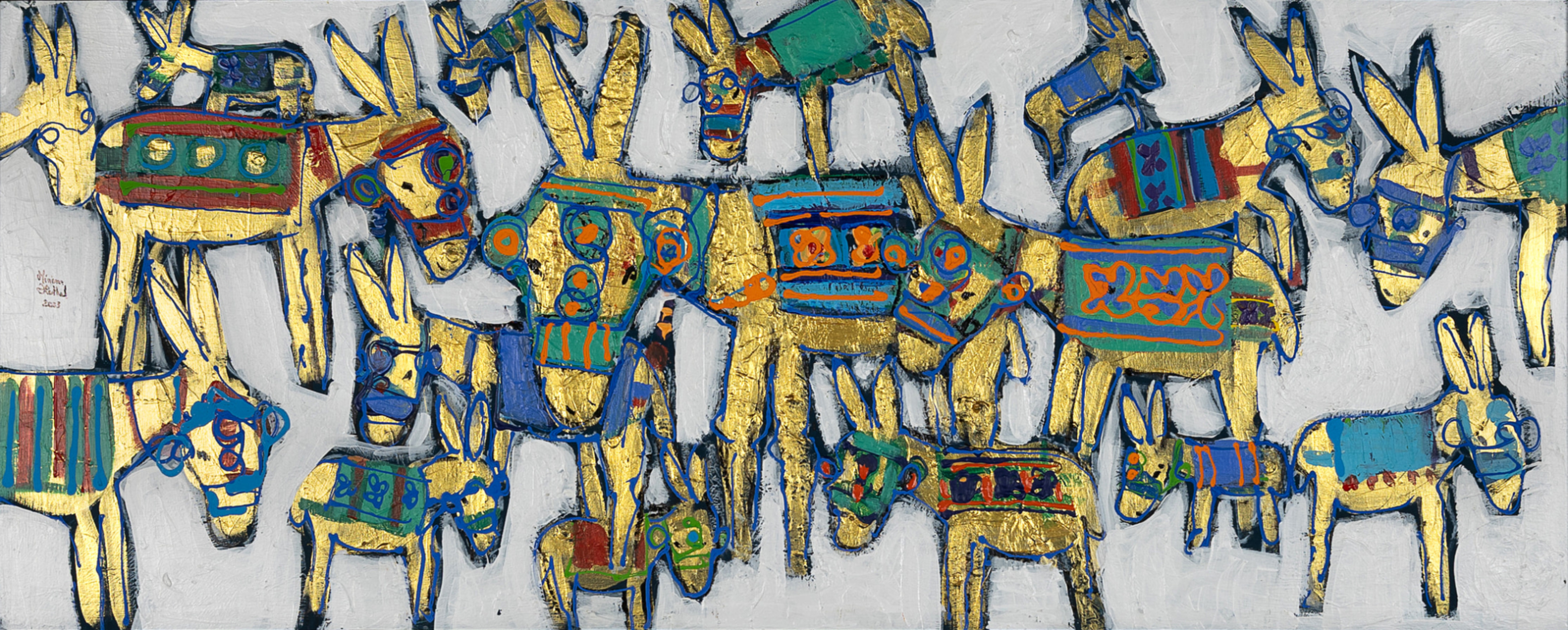 Miriam Hathout is a passionate painter who uses vibrant colors to portray scenes from the Egyptian countryside. Donkeys, dancers, and women harvesting in the fields are common themes in her work.