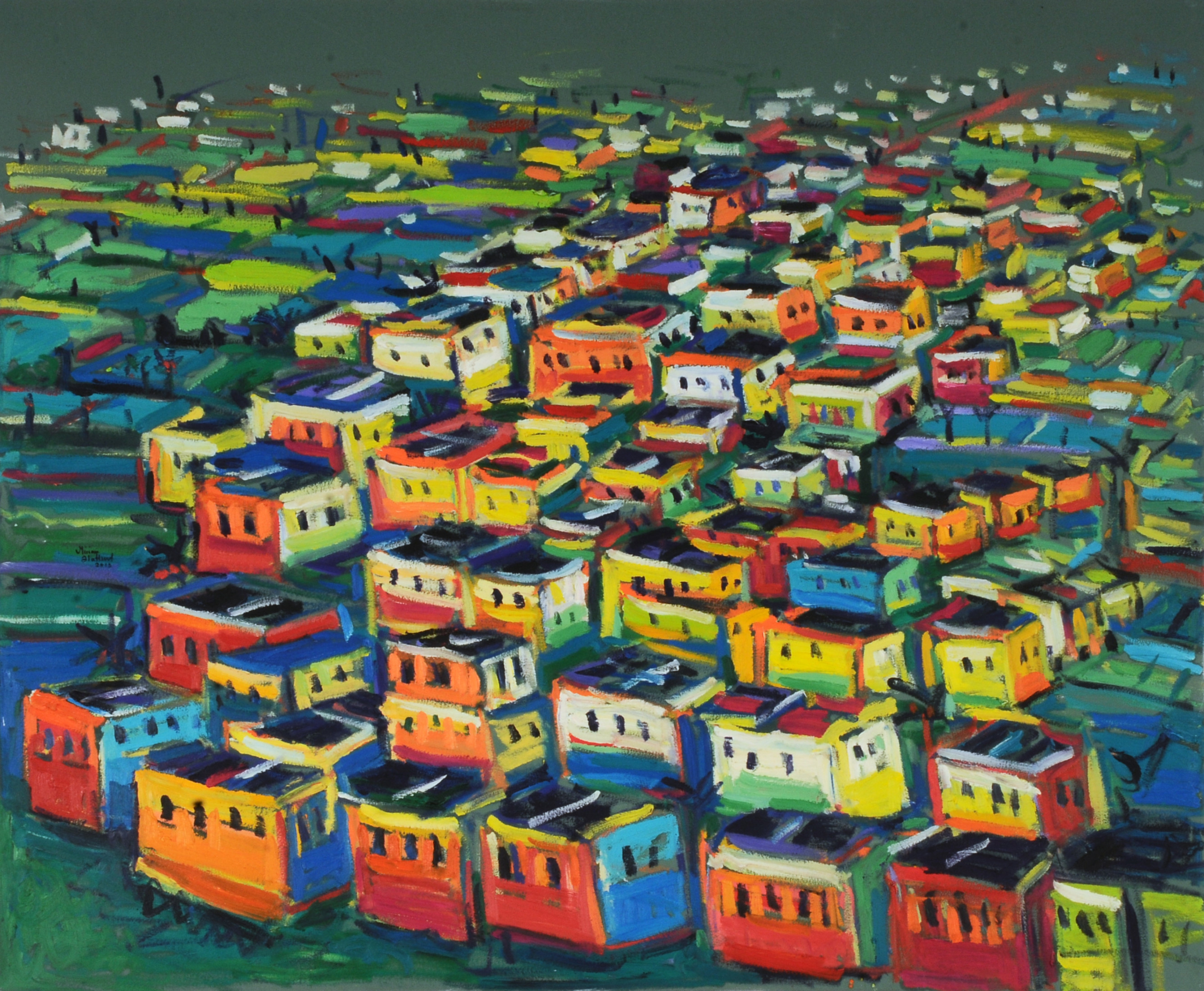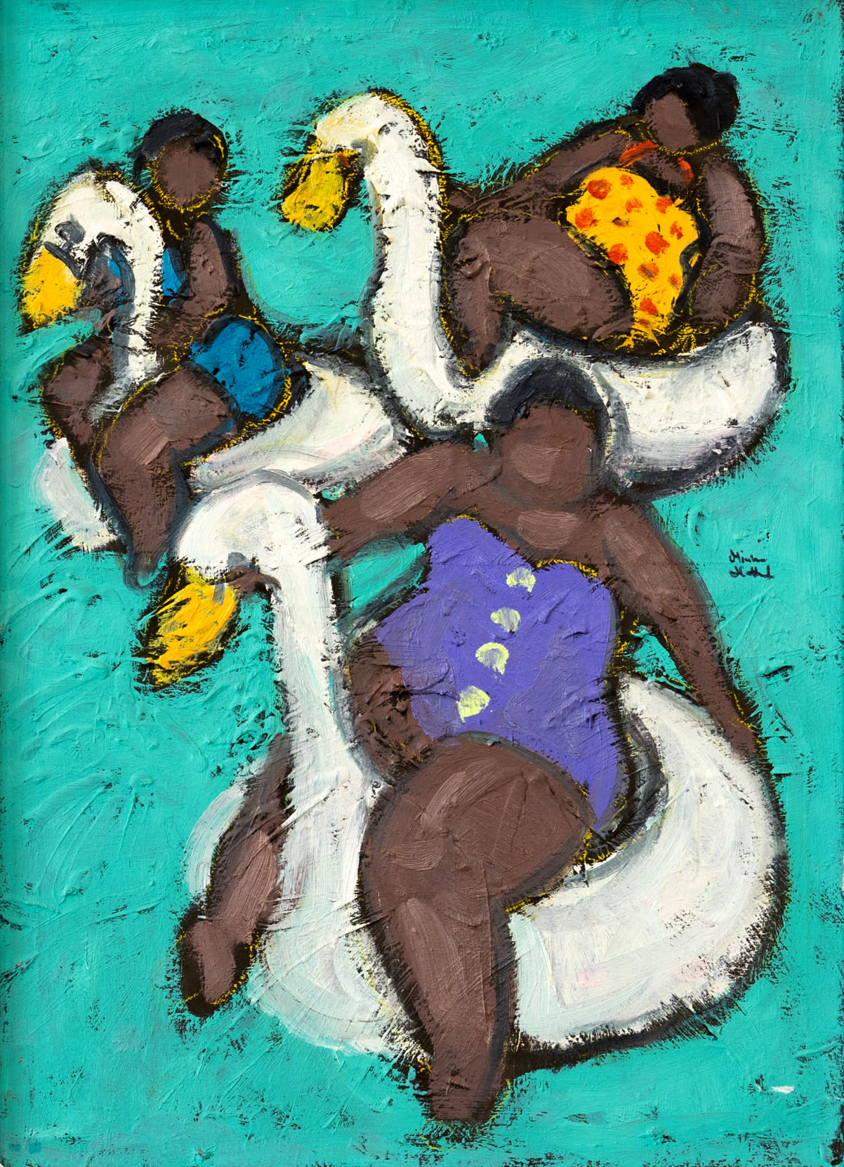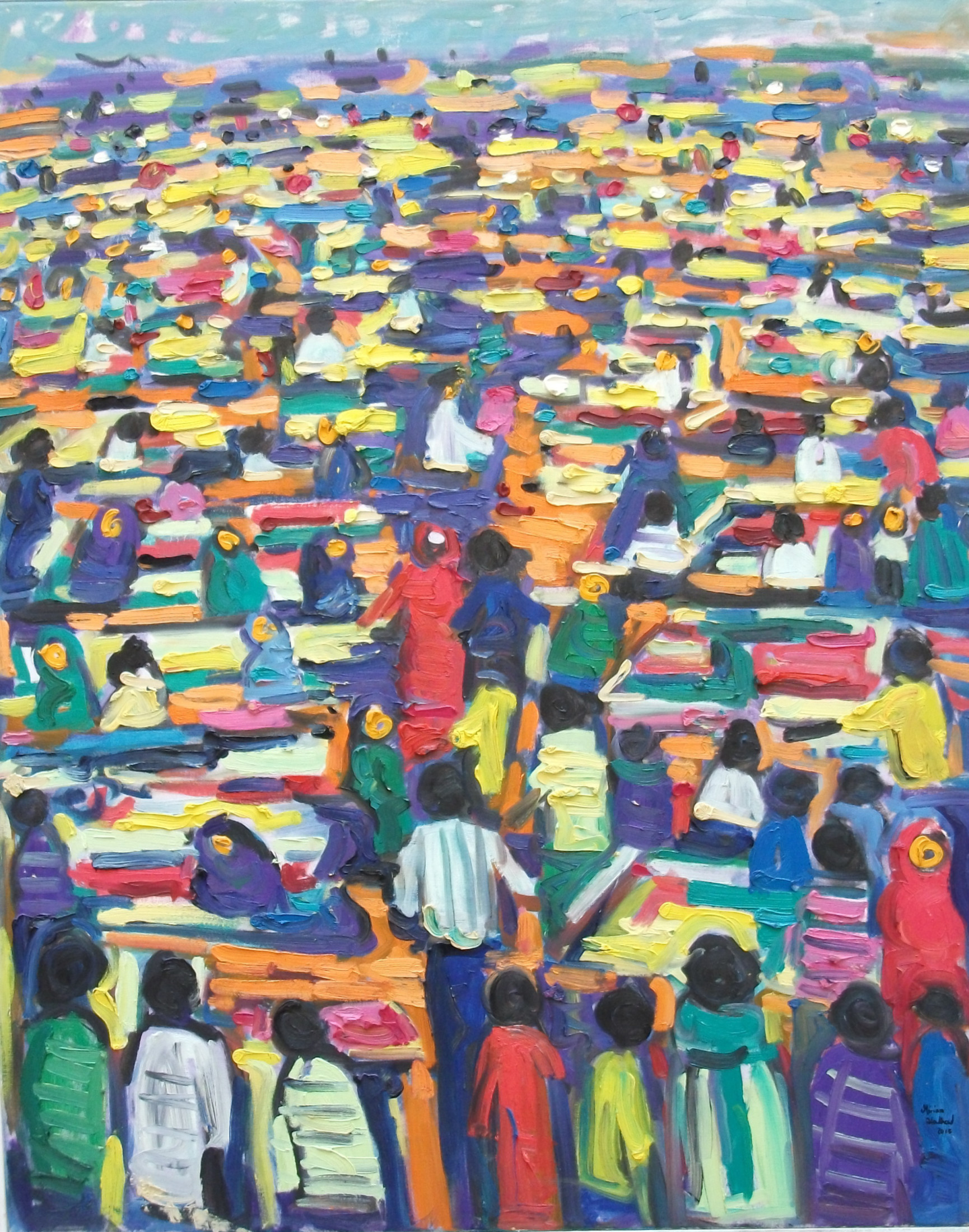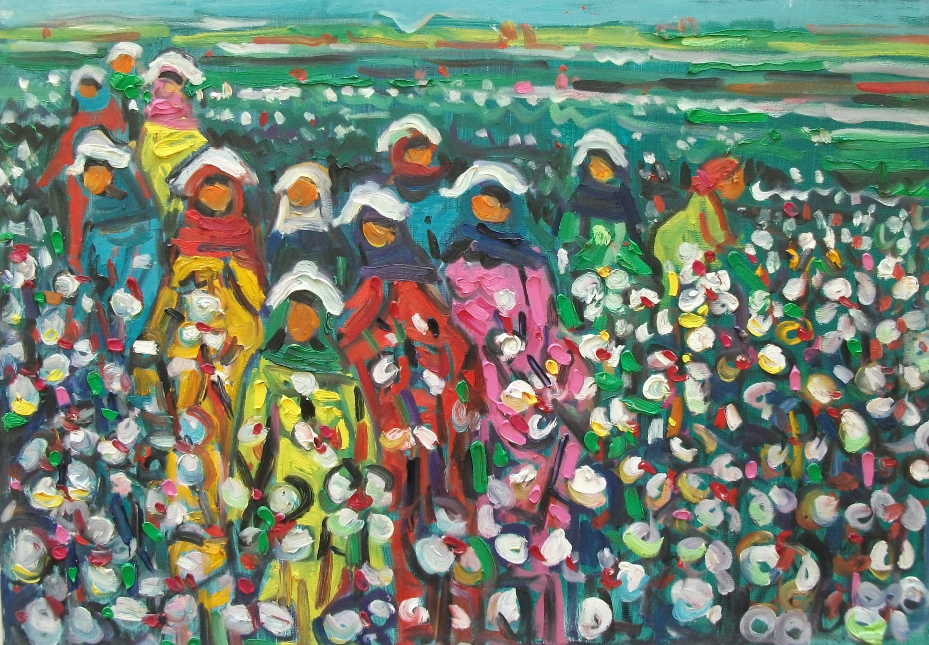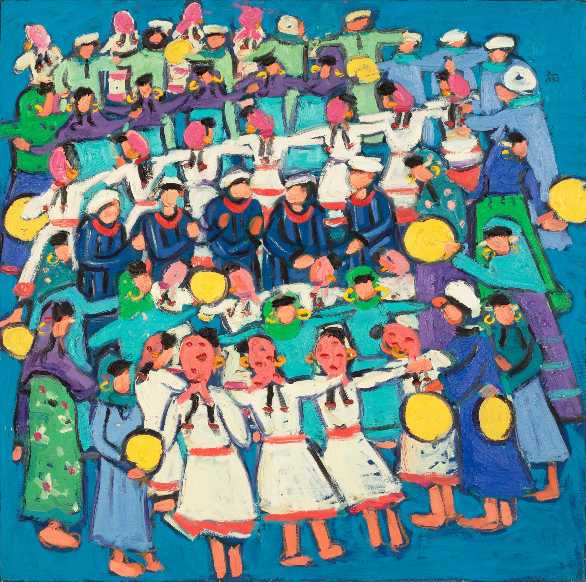 Miriam Hathout is a passionate painter who uses vibrant colors to portray scenes from the Egyptian countryside. Donkeys, dancers, and women harvesting in the fields are common themes in her work.