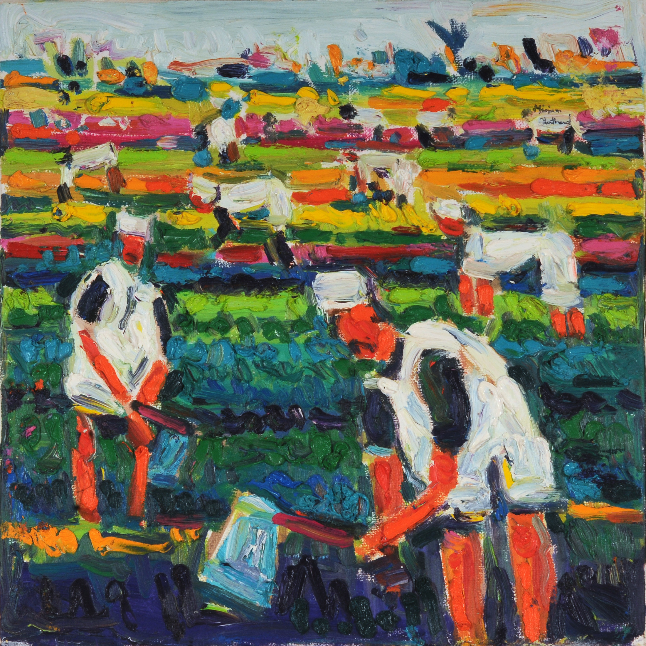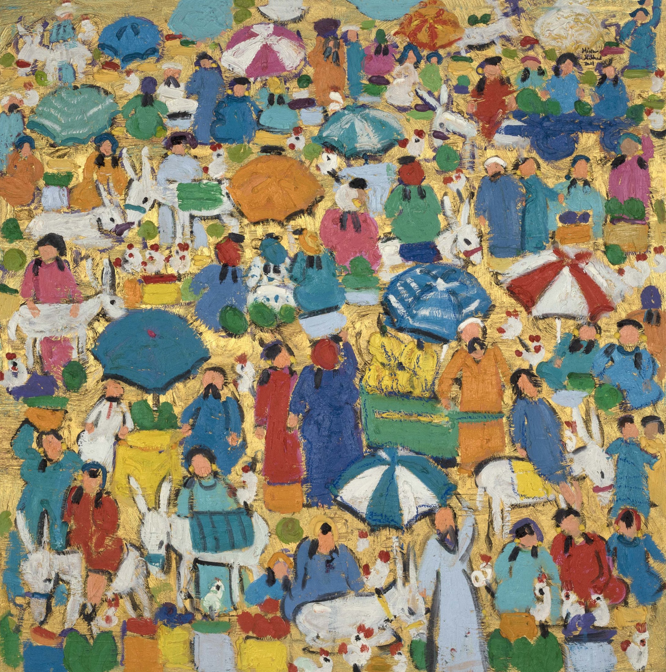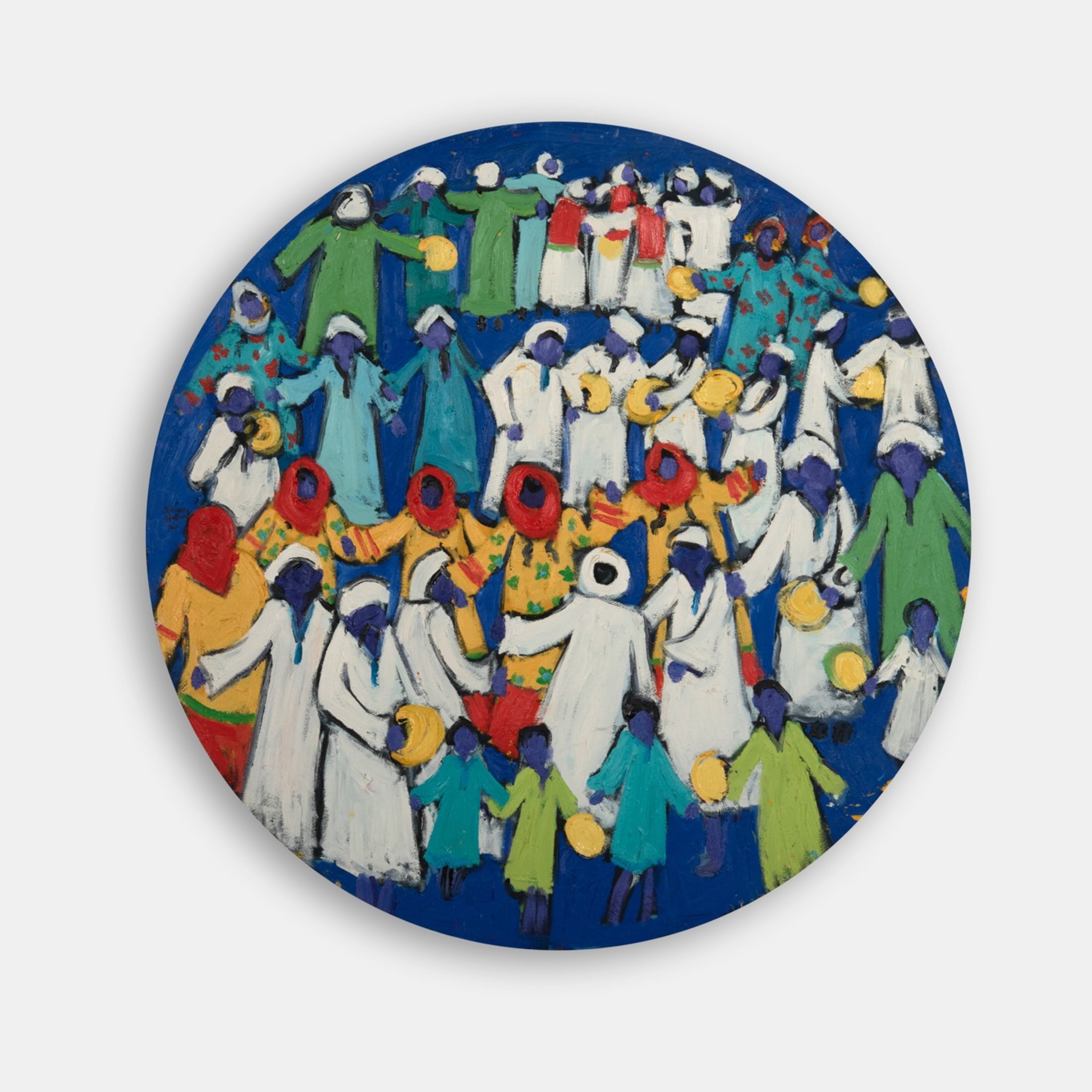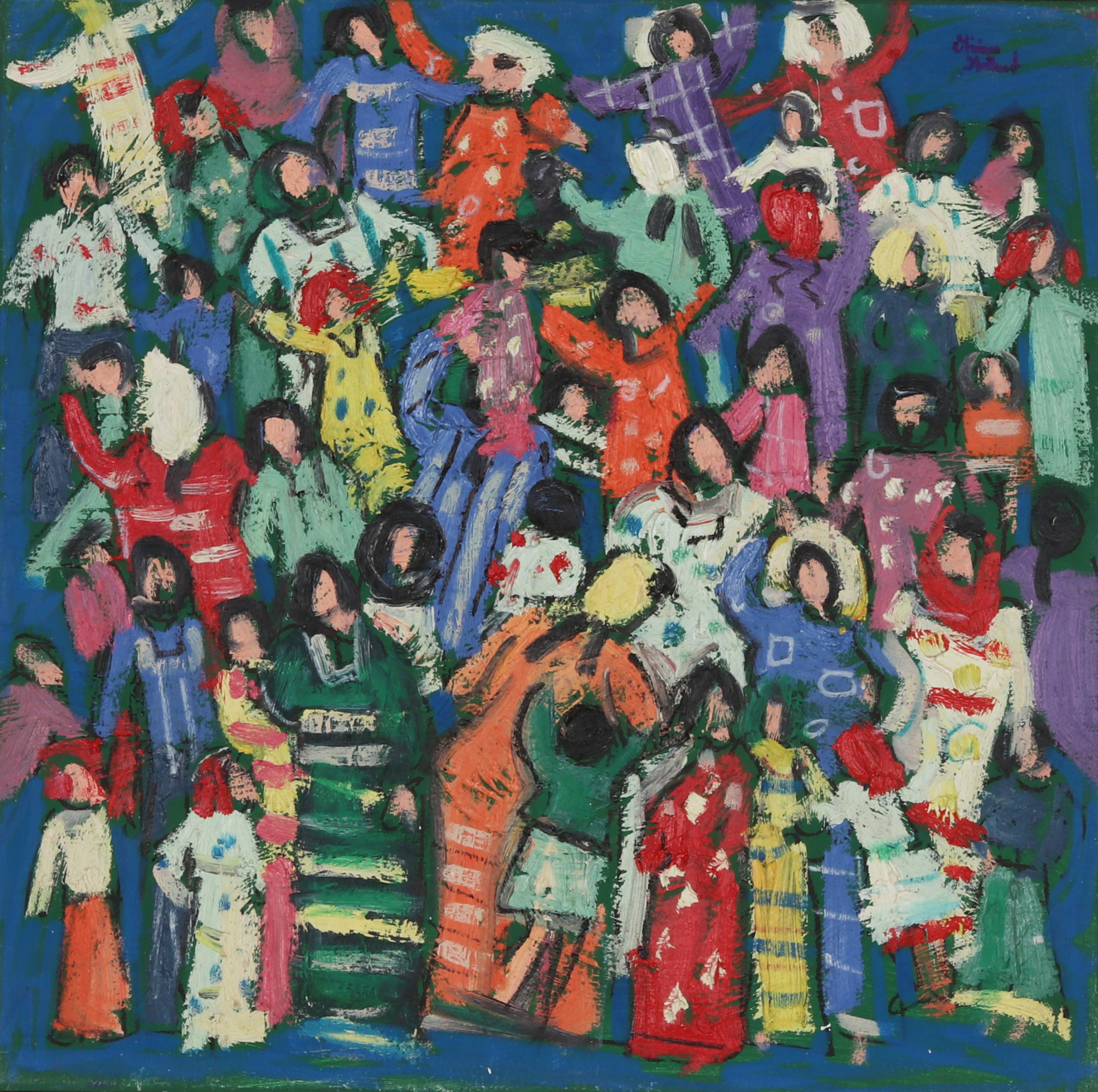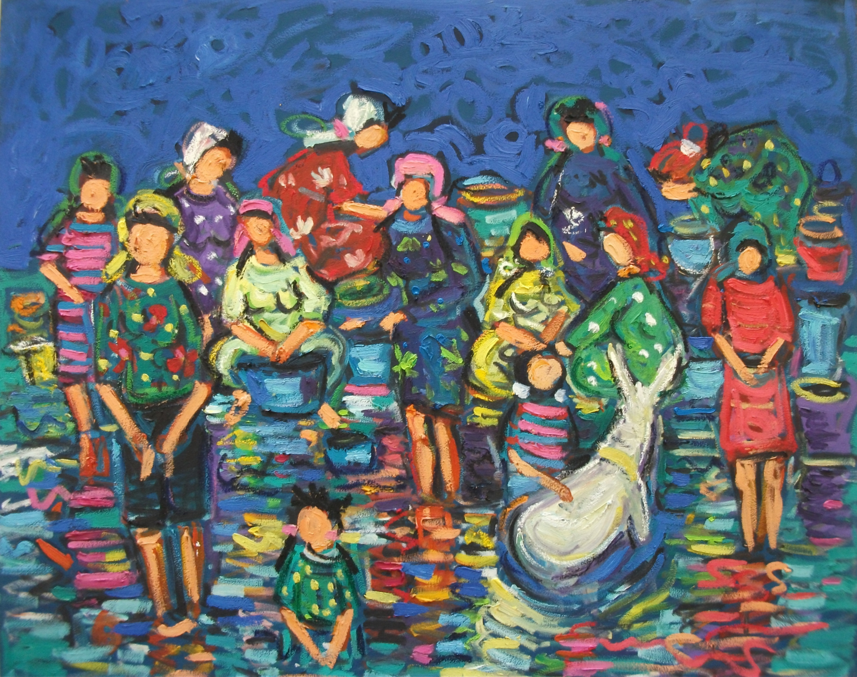 Miriam Hathout is a passionate painter who uses vibrant colors to portray scenes from the Egyptian countryside. Donkeys, dancers, and women harvesting in the fields are common themes in her work.