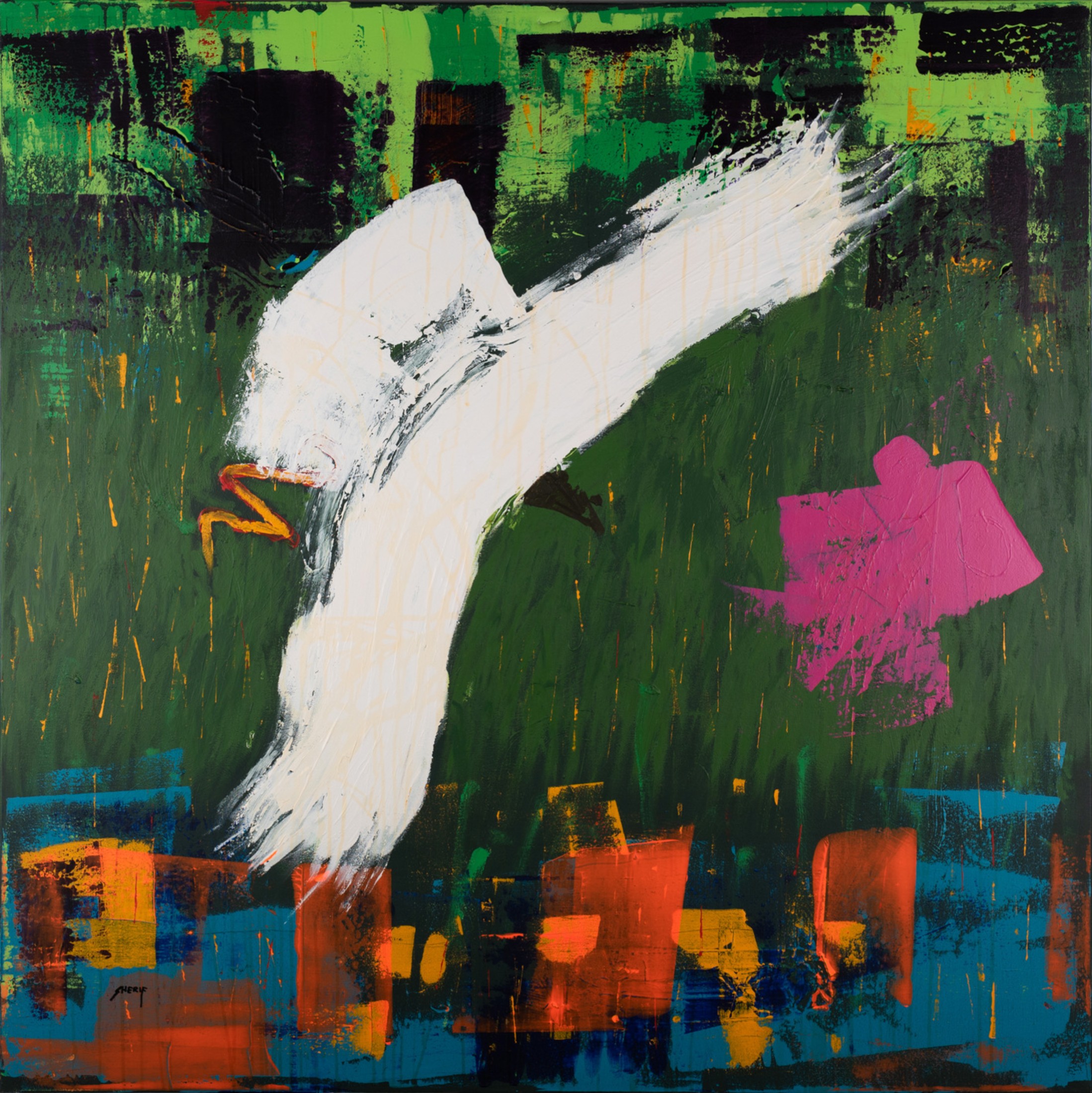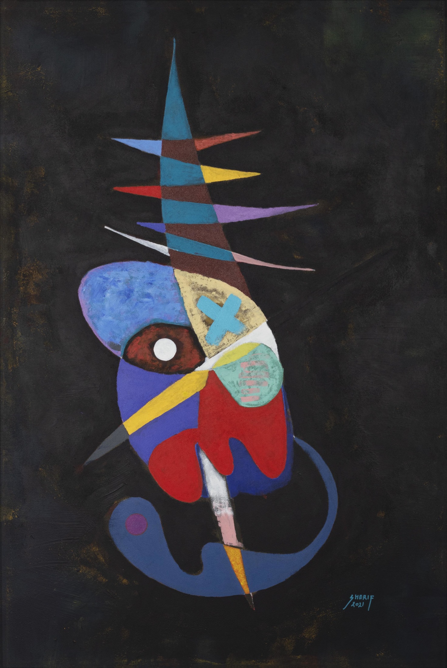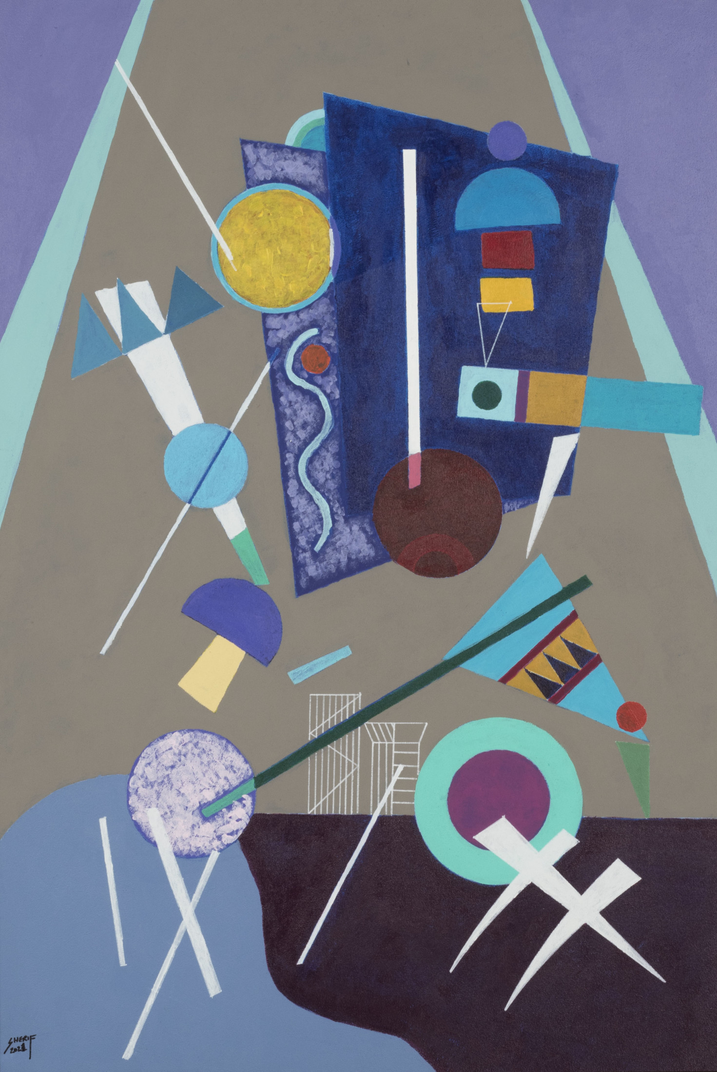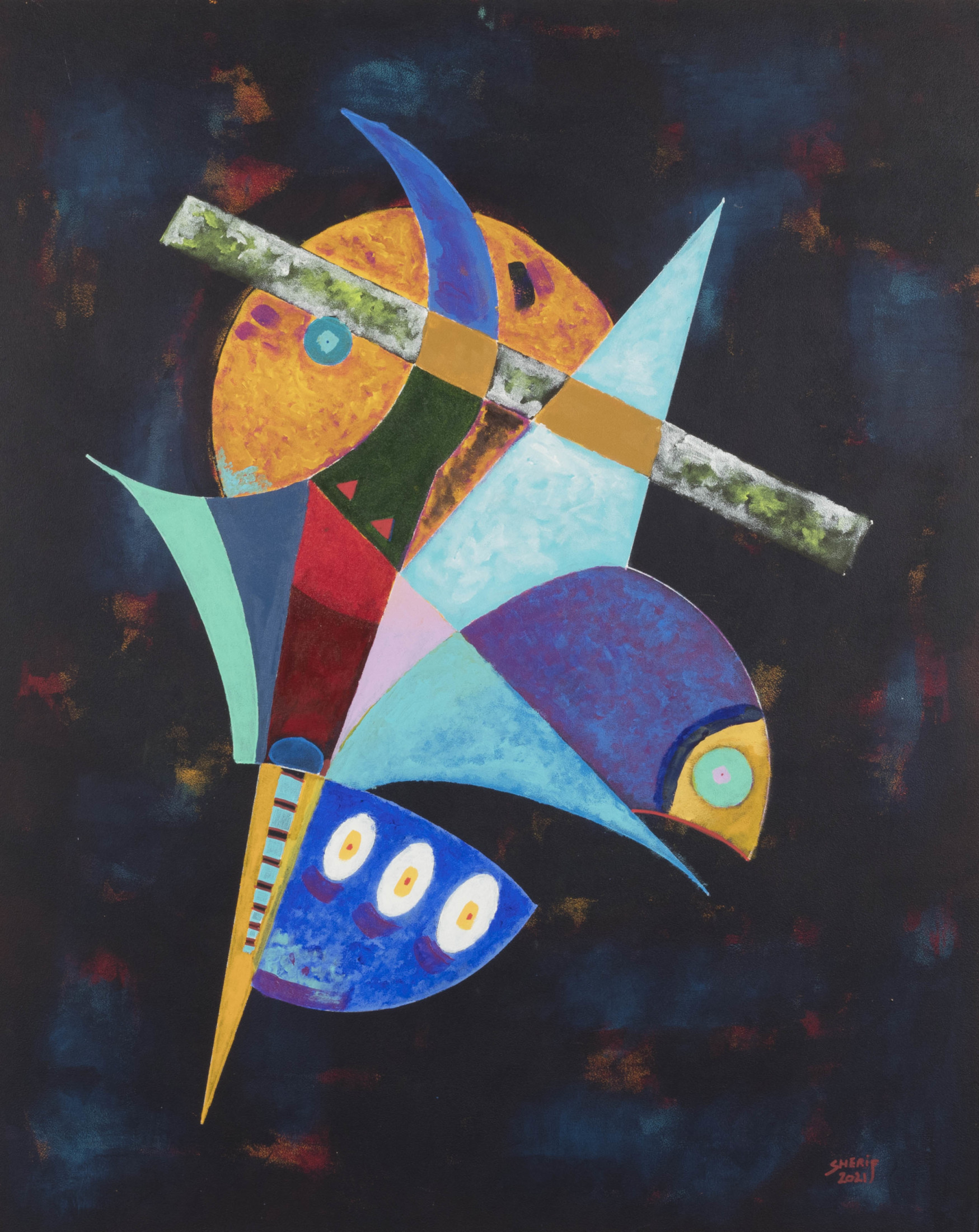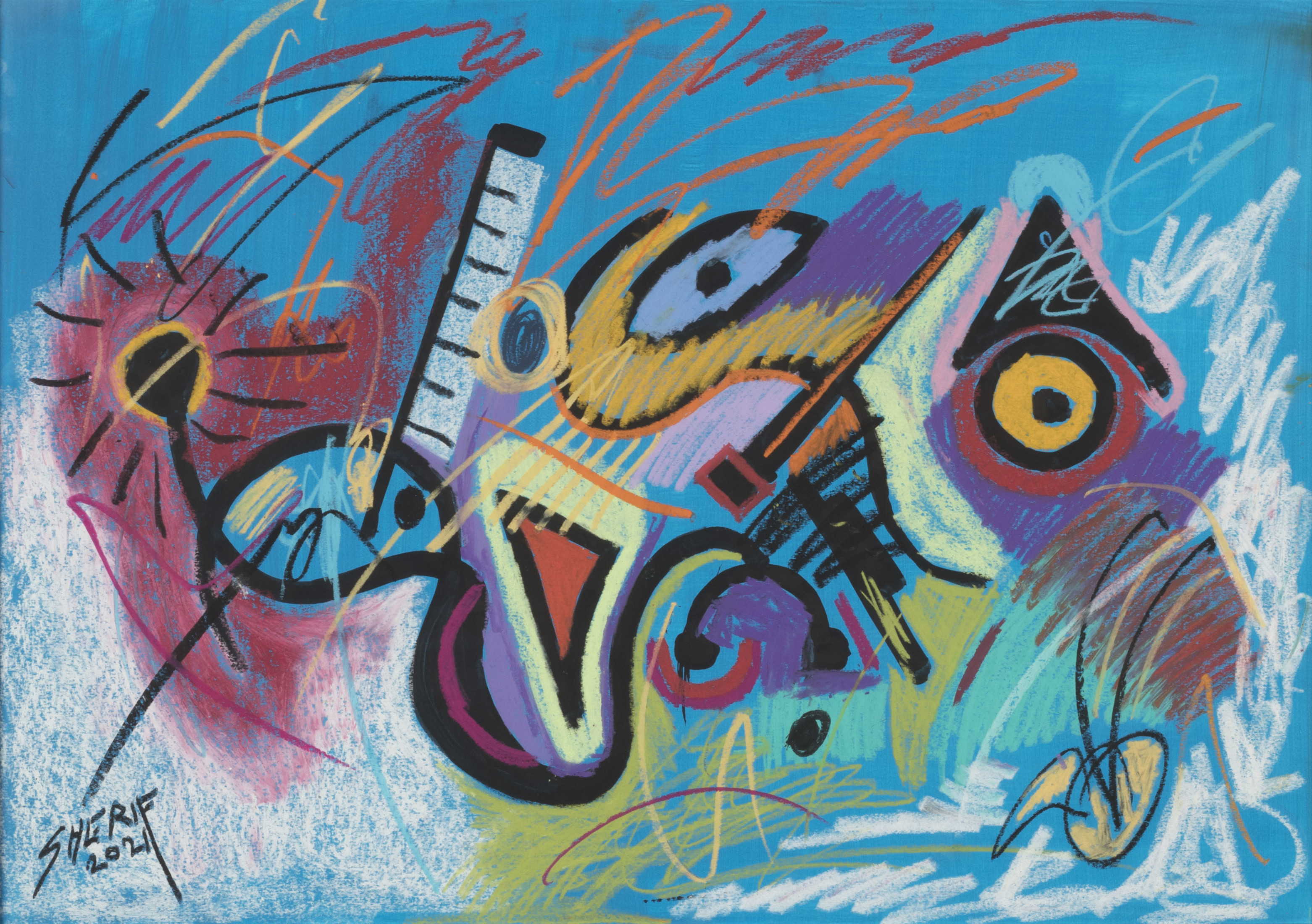 Sherif Taher is an Egyptian artist who graduated from Riverside Military Academy – Georgia, the USA in 1990. He obtained a commercial pilot license from Phoenix East Aviation I.N.C. Florida, USA (1994). He developed his artistic talent through years of study while he was in the USA and after working as a co-pilot in the Red Sea Company for many years, he decided to shift careers and focus on being a full-time artist. Sherif’s art career was also developed by the Egyptian artists Mohamed Safwat, Yousry Hassan, the two brothers Mohamed and Ashraf El Azhary as well as the department of Liberal Studies, Faculty of Fine Arts. Sherif's art is influenced by music as evident in his use of symbols and color schemes.