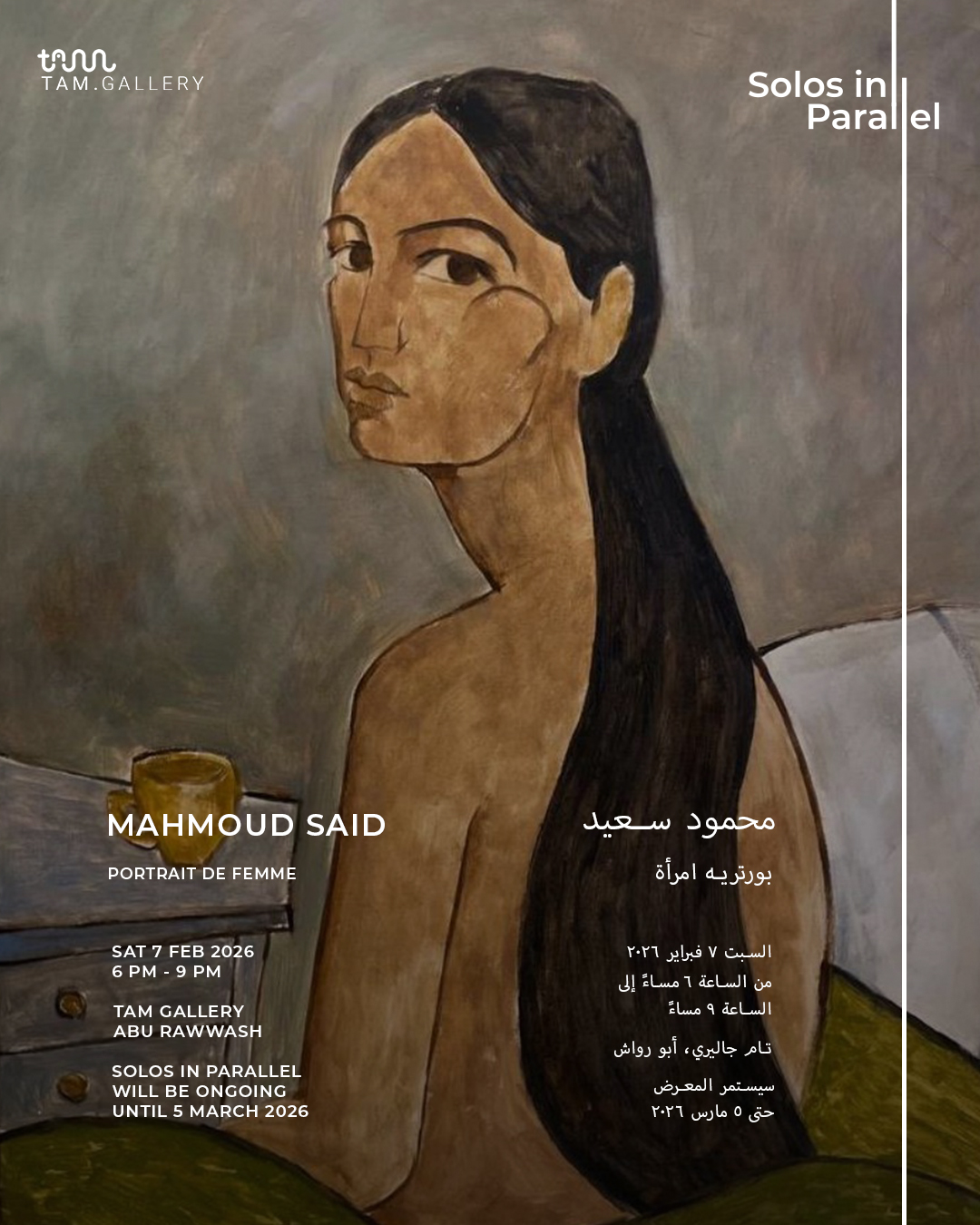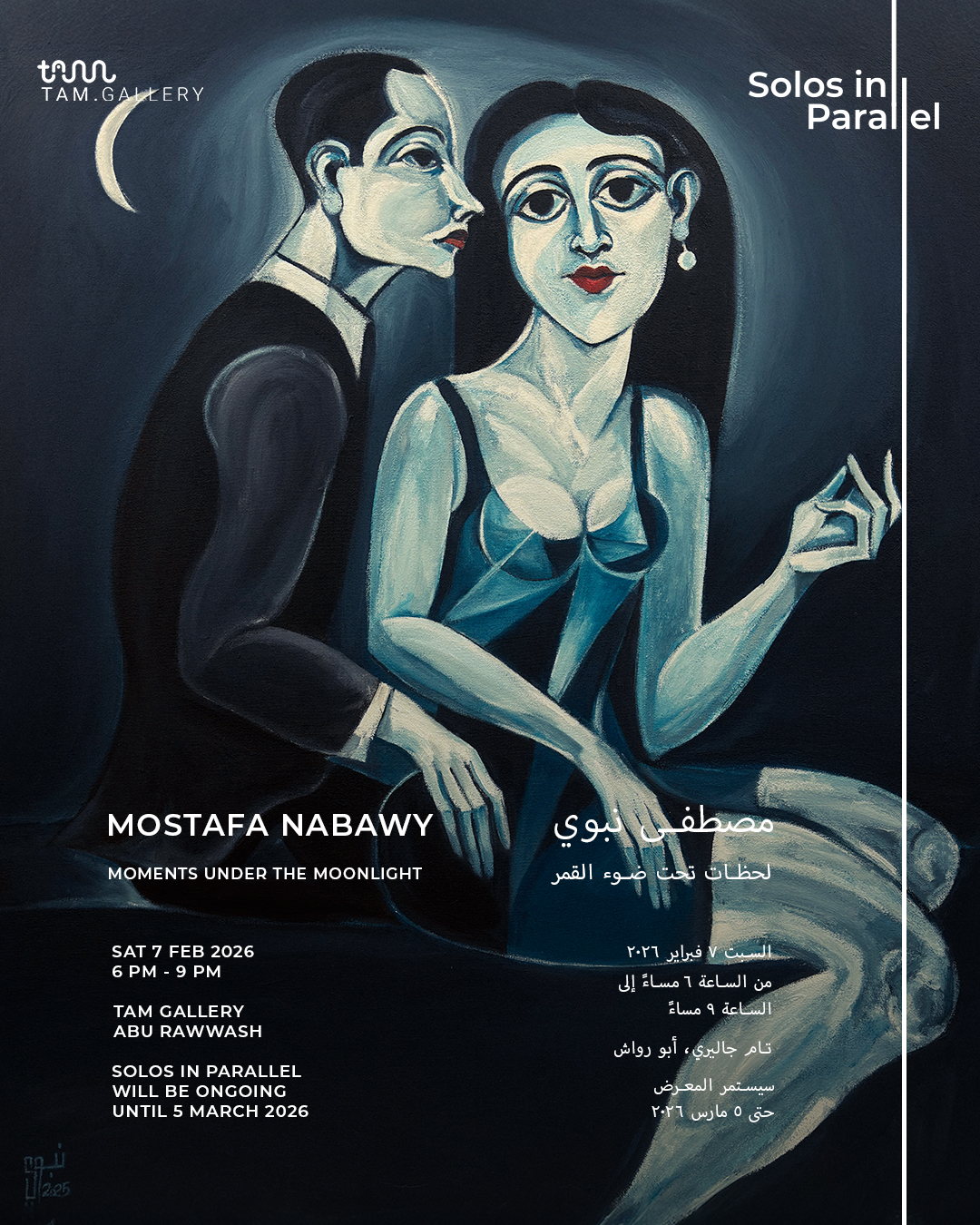 يسرّ تام جاليري دعوتكم لحضور الافتتاح الرسمي لمعرض Solos in Parallel، والذي يجمع بين معرضين فرديين للفنانين محمود سعيد ومصطفى نبوي.